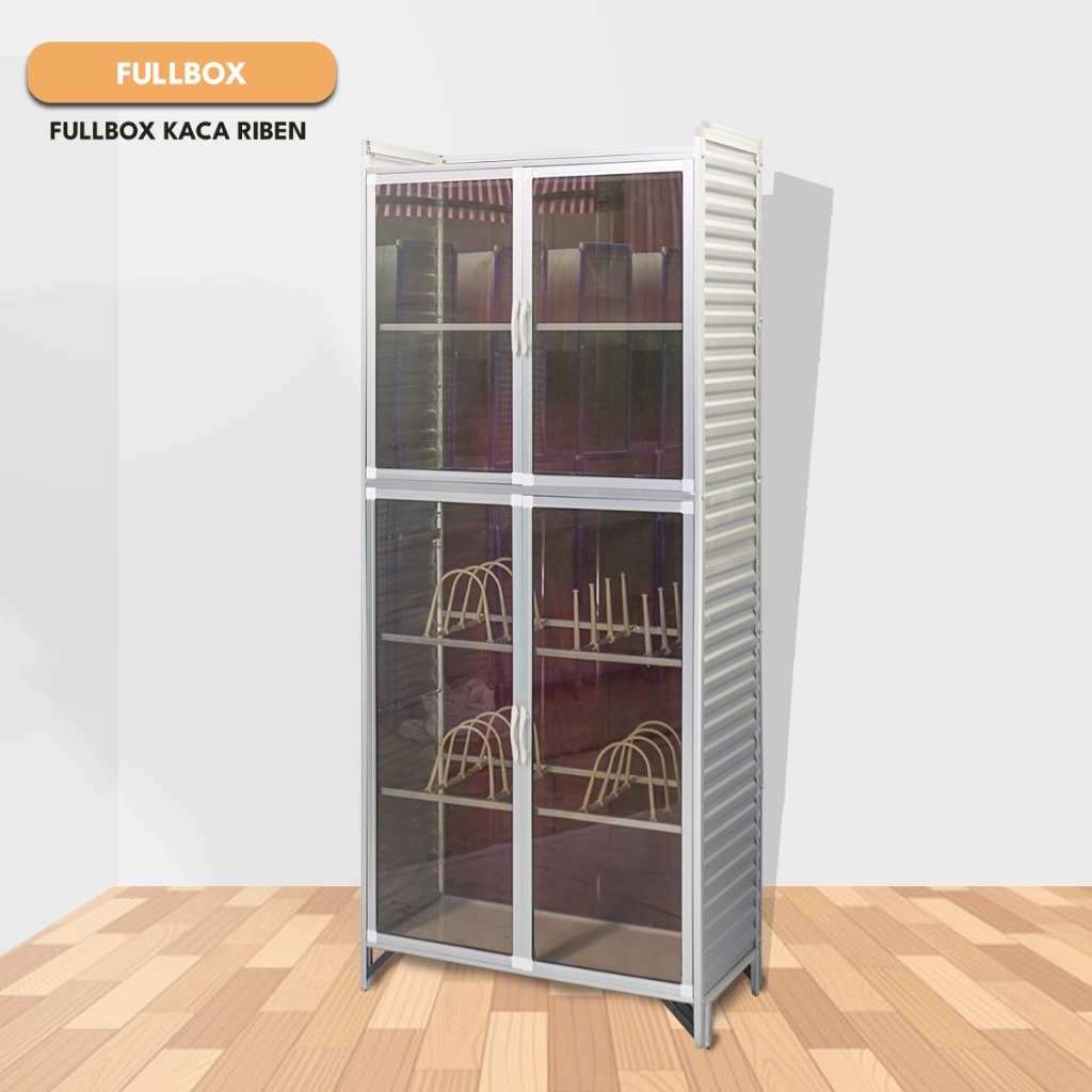 lemari kaca dapur Lemari Rak Piring & Makanan Aluminium 2 Susun 4 Pintu – Kaca Riben / Kaca Es – 162cm