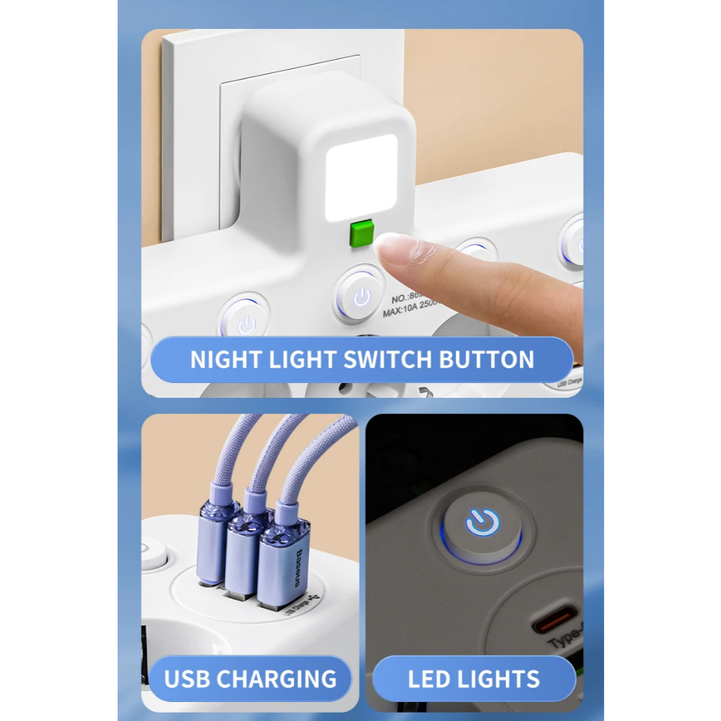 Strip Multi Outlets Stopkontak LED Light Type C USB Daya dengan Steker EU Plug Power Port