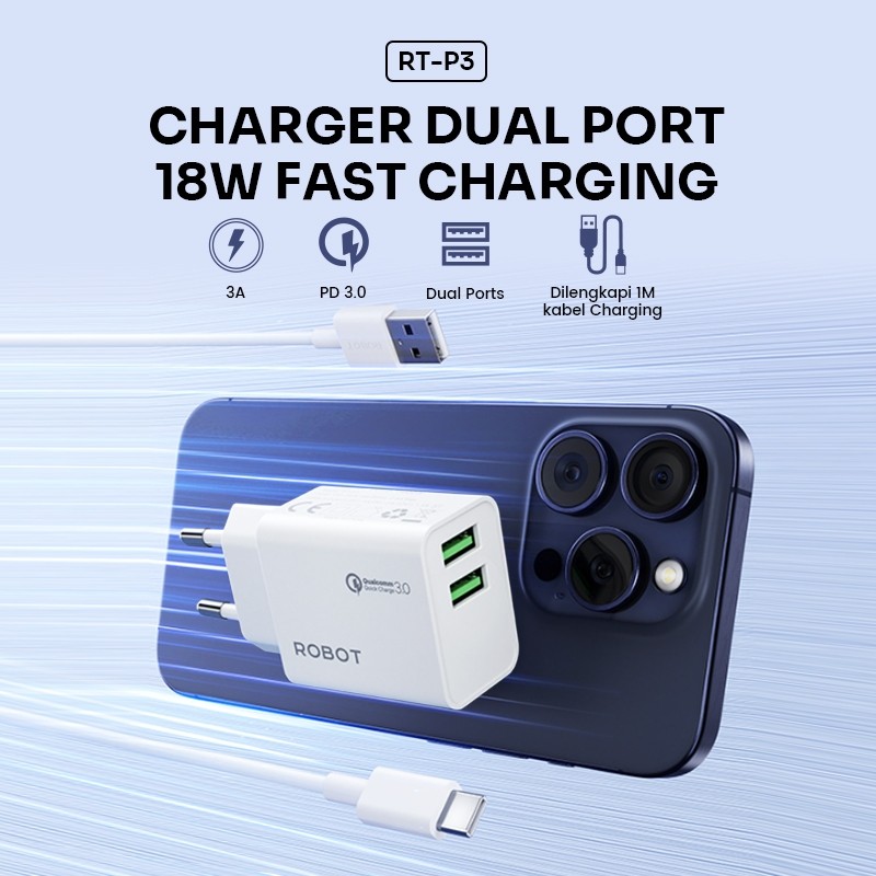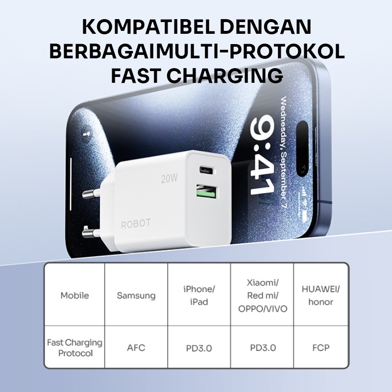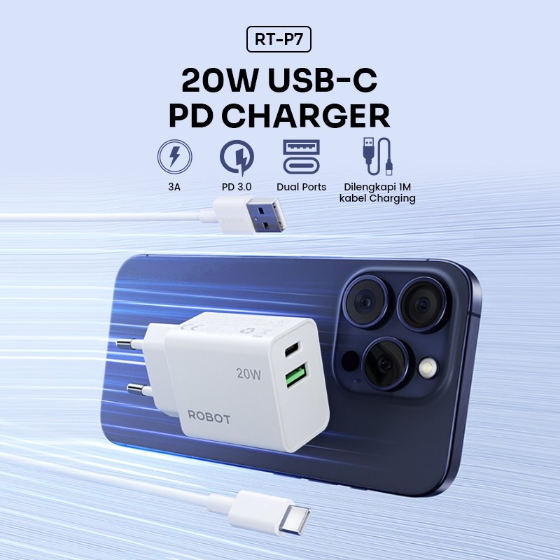 ROBOT Adapter Charger Fast Charging 20W Dual Port USB-A USB-C FREE Kabel Type-C RT-P1 Original - Garansi 1 Tahun