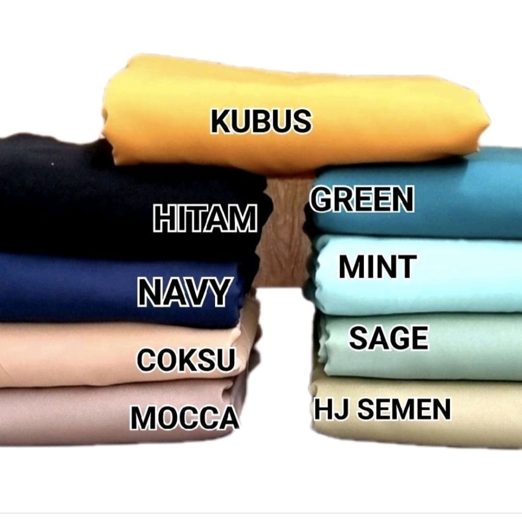 Hitam, Navy, Maroon, Putih, Bw, Abu Tua, Abu SMA, Silver, Abu Muda, Denim, Taro, Lavender, Lilac, Peach, Dusty Pink, Milo, Kubus, Green, Mint, Sage, Hijau Semen, Coksu, Mocca, Khaki, Cokpi/Mahogany, Hijau Botol, Army, Burgundy, Turqis