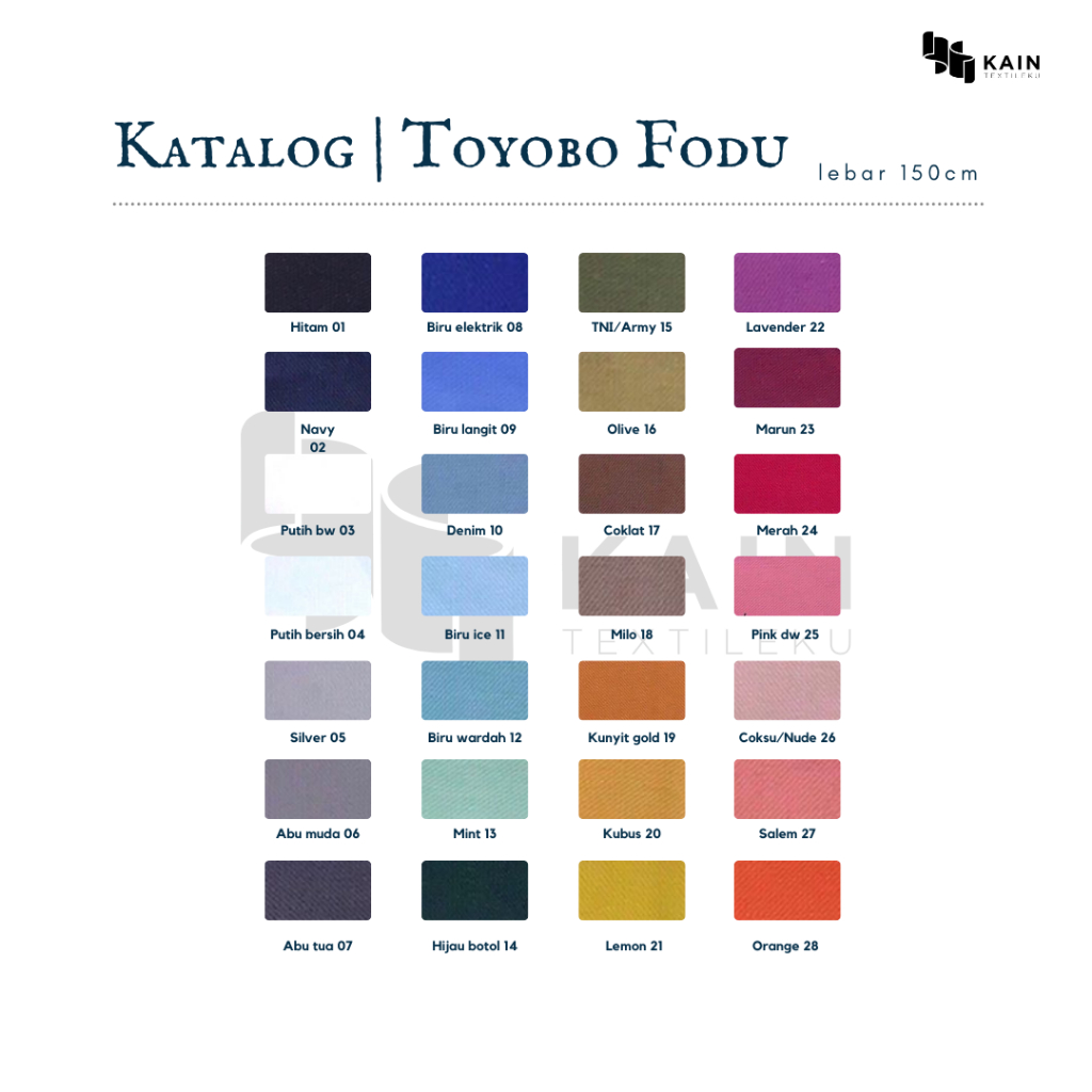 Hitam, Navy, Silver, Abu muda, Abu tua, Biru elektrik, Biru langit, Denim, Biru ice, Biru wardah, Mint, Hijau botol, TNI/Army, Olive, Coklat, Milo, Kunyit gold, Kubus, Lemon, Lavender, Marun, Merah, Pink dw, Coksu/Nude, Salem, Orange, Alpukat, Merah bata, Moka, Silver cream, Green tea, Emerald, Toska, Ungu plum, Magenta, Abu tua xtra, Pink dusty, Caramel, Khaki, Ungu muda, Kopi, Pink muda, Biru turkish, Toska tua, Kaktus, Kuning, Abu dusty, Old rose, Pink darwin, Red wood, Cokrem, Latte, Sage green, Biru dusty, Dark sage, Burgundy, Jeans, Wrna Lain DIKATALOG, Baby purple, Ivory, Soft mint, Biru artic