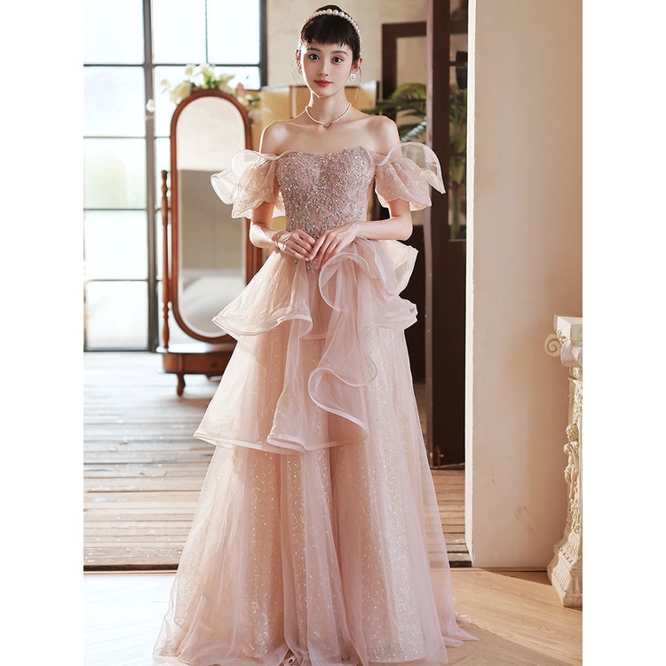 [Star] Gaun malam Prancis merah muda wanita baru high-end cahaya mewah perjamuan temperamen gaun panjang pertunangan