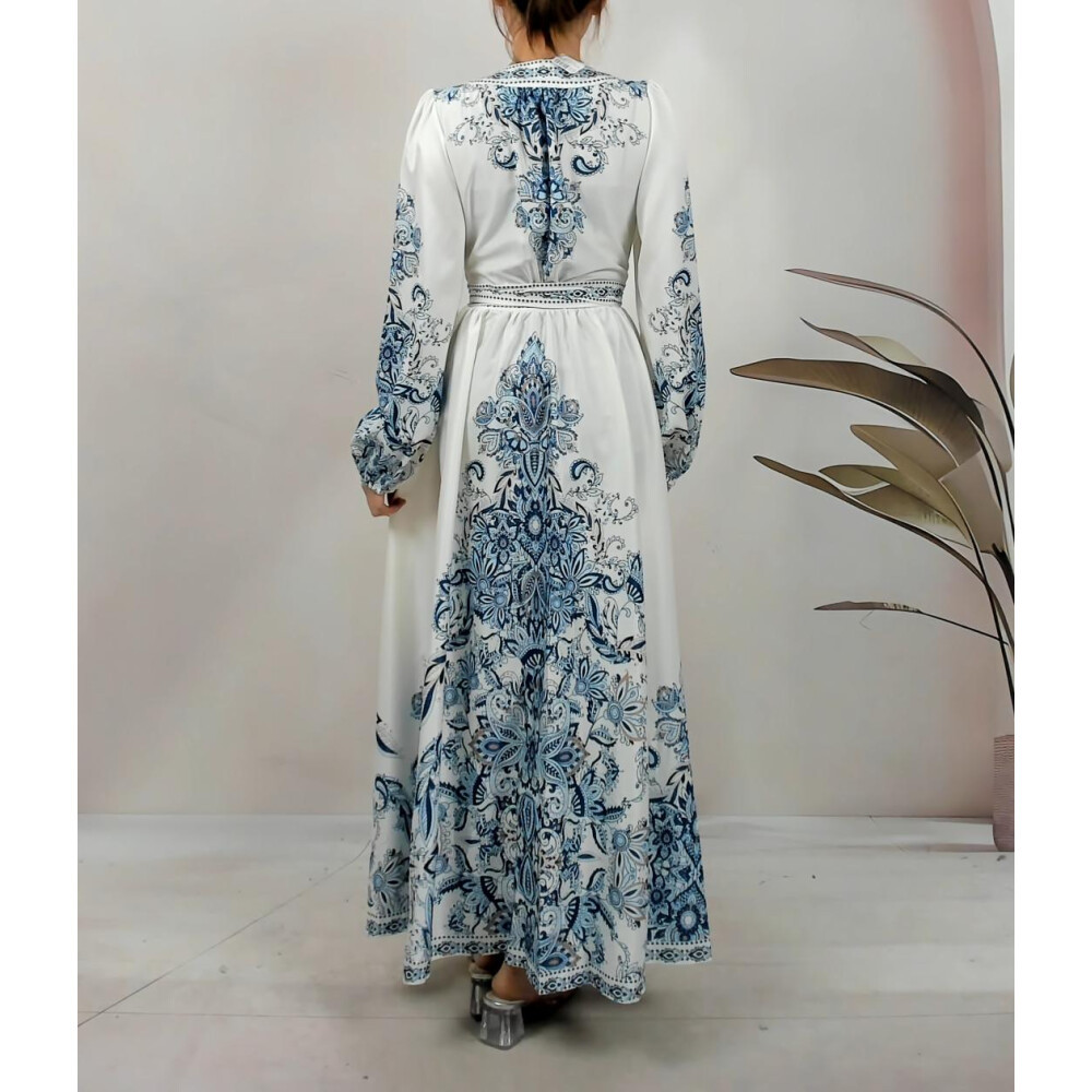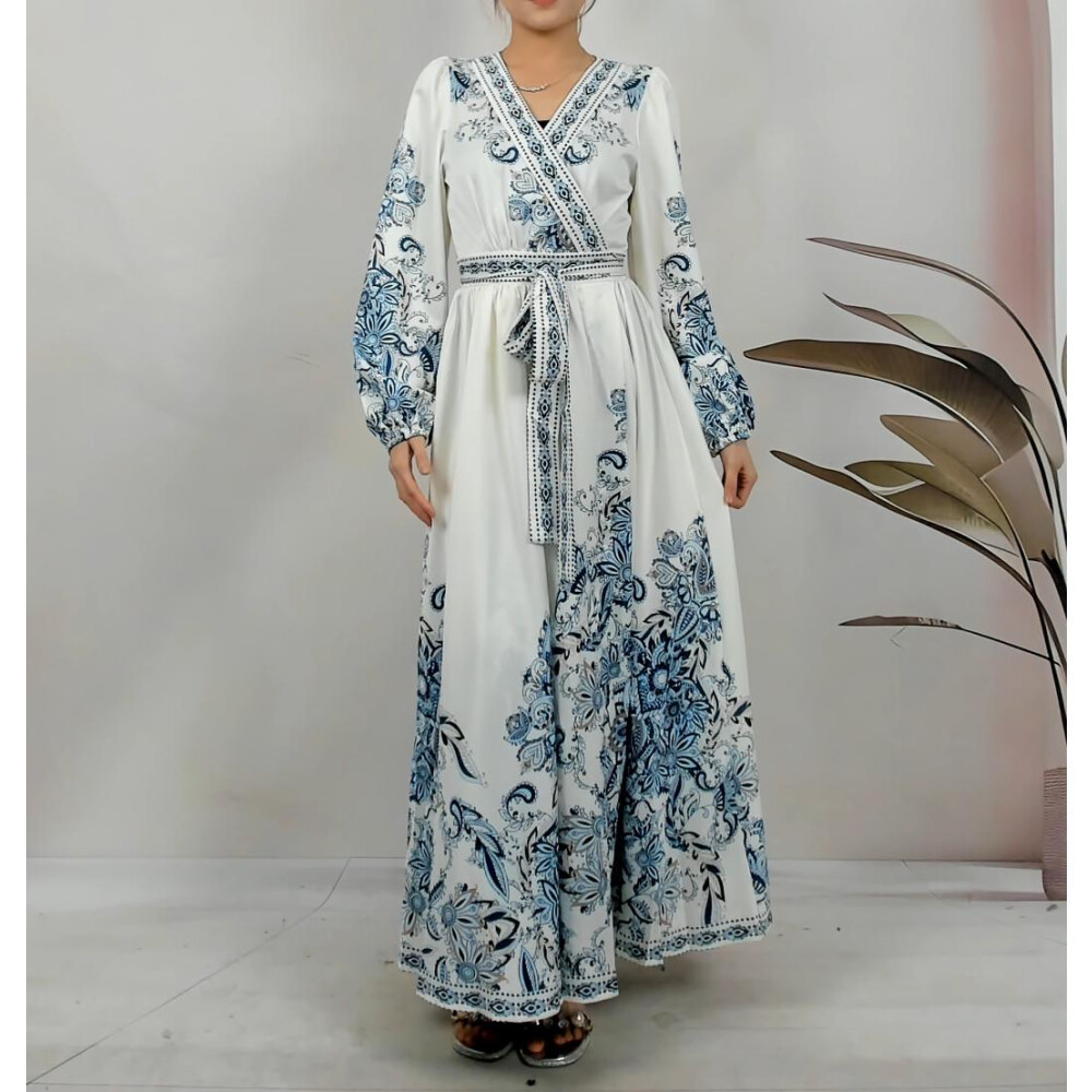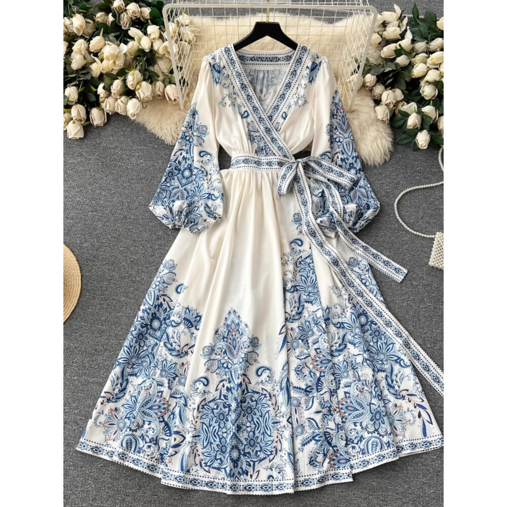 [Star] FADFAD Gaun Rok Panjang Sedang Lengan Panjang Pinggang Bertali Bermotif Gaya Casual