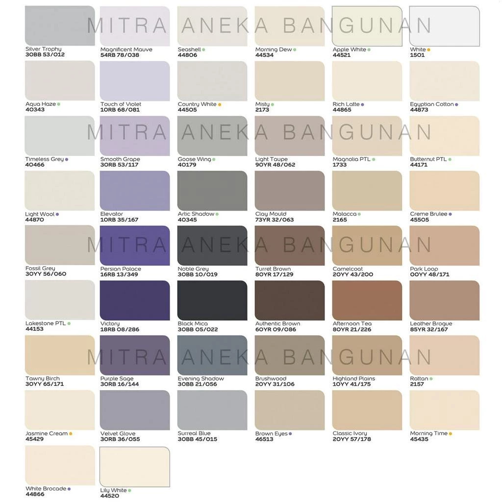 WARNA LAIN CHAT DULU, WHITE ON WHITE, PUTIH 888, AGED STUCCO, JADE GREEN 42353, GRAVEL PIT, PACIFIC PEARL, UNIVERSAL GREY, SUGAR TOUCH, FROST GREY, BRUSHWOOD, BALI HAI, WHITE LILAC, LEMON GRASS, BERYL GREEN, TURRET BROWN, FLOURISH GREEN, PEACOCK FAN, PEA WALL, MIDGETGOLF GREEN, LAKEFRONT, GREY PENNANT, CAMELCOAT, SEAMIST 40115, MODERN MEDITATION, STRAW, SUPER WHITE 44177, BLUE WAVE, VENICE BLUE, PARK LOOP, ORCHID 44502T, OFF WHITE 44197, CLINIC WHITE, PEACH POWDER, AFTERNOON TEA, PUTIH LAGUNA, SENSATIONAL MOOD, NOBLE GREY, VANILLA SENSATION, PINE FOREST GREEN, MARIGOLD, SWISS WHITE, PLANTATION GREEN, CORAL SPRING, GRANITE GREY 40389, CONTINENTAL TILE, TOASTY GREY, MOUSE TAIL, BENTLEY BLUE, GREY SAND, PEBBLE MOSAIC, HERBS GARDEN, EVENING SHADOW, SUMMER HAZE, SILVER TROPHY, EGYPTIAN COTTON 40YY, 45493 DELIGHT CREME, PUPPY LOVE, COOL DIP, CIGAR, SMOKE GREY, PEACOCK SENSATION, IVORY 45360, SEVEN LAKES, DESERT WARMTH, BALI SAND, CLOUDY BLUE, SLATE DREAM, CAROLINA STRAND, KHAKI GREEN, VENETIAN TURQUOISE, TEARDROP, BLUE BOW, SOFT FAUNA, MOONSTONE, LEATHER BROGUE, BELLCOURT CASTLE, SKYLIGHT DARKNESS, PASTURE GREEN, GREEN SEEWEED, PINK SNOW, BALI GREEN, LITTLE BOW PINK, PARADISE GREEN, BAMBOO TWIST, CAPE STORM, GLOWING BROWN, BRILLIANT WHITE, AUTHENTIC BROWN, PAINTER'S WHITE, WOOD SMOKE, VICTORIAN SAGE, DEEP WELL, CREAM CHIC, BREAKING GREY, MOCCA, ICELANDIC WATERS, THAI TEAL, THOMAS POINT LIGHT, RENOIR BISQUE, 2" INCH