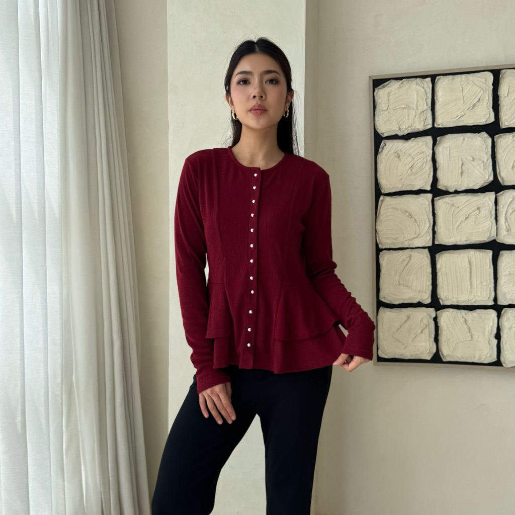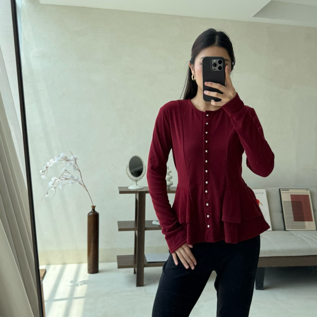 BAJU KEKINIAN WANITA Atasan Kardigan Peplum Knit Kancing Wanita Babydoll Button Top Lengan Panjang Kancing