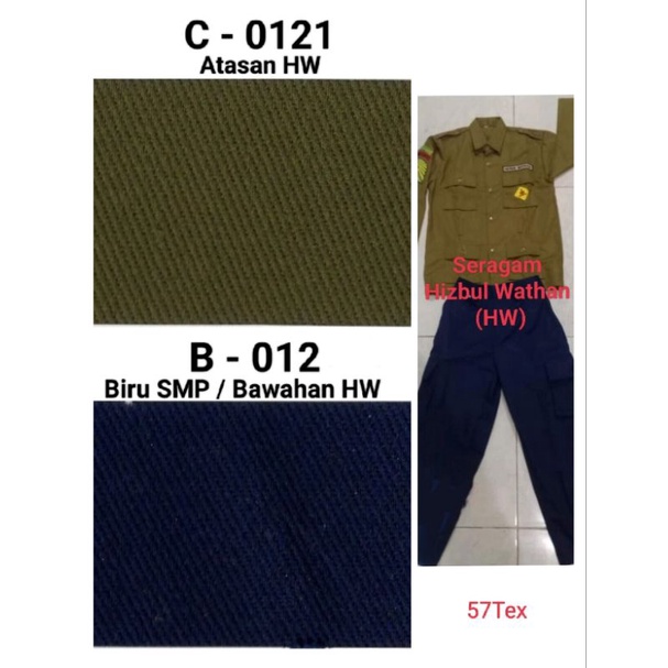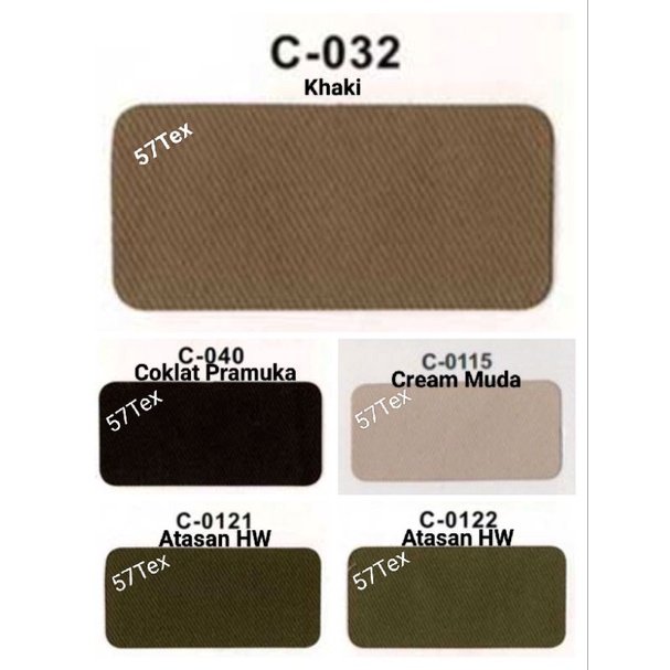A-200 (Abu Muda), A-020 (Abu SMA), A-48 (Abu Tua), B-012 (Biru SMP/HW), B-21 (Navy), B-035 (Blue Black), C-0115 (Cream Muda), C-0121 (Atasan HW), C-032 (Khaki), C-040 (Pramuka), K-019 (Orange), M-022 (Merah), M-074 (Merah SD), H-00 (Hitam), H-020 (Hijau Army), P-00 (Putih), C-0122 (Atasan HW), B-06 (Biru Elektrik), C-026, C-0116 (Cream), A-100 (Abu Muda), C-023, H-023 (Hijau), B-392 (Turkish), U-098 (Ungu), B-090, G-025, B-073
