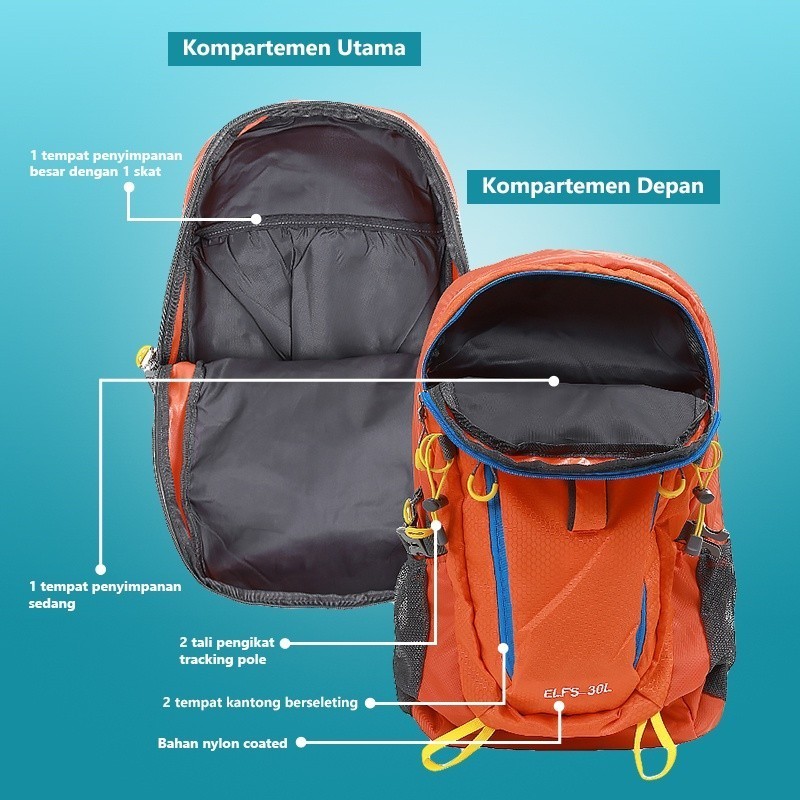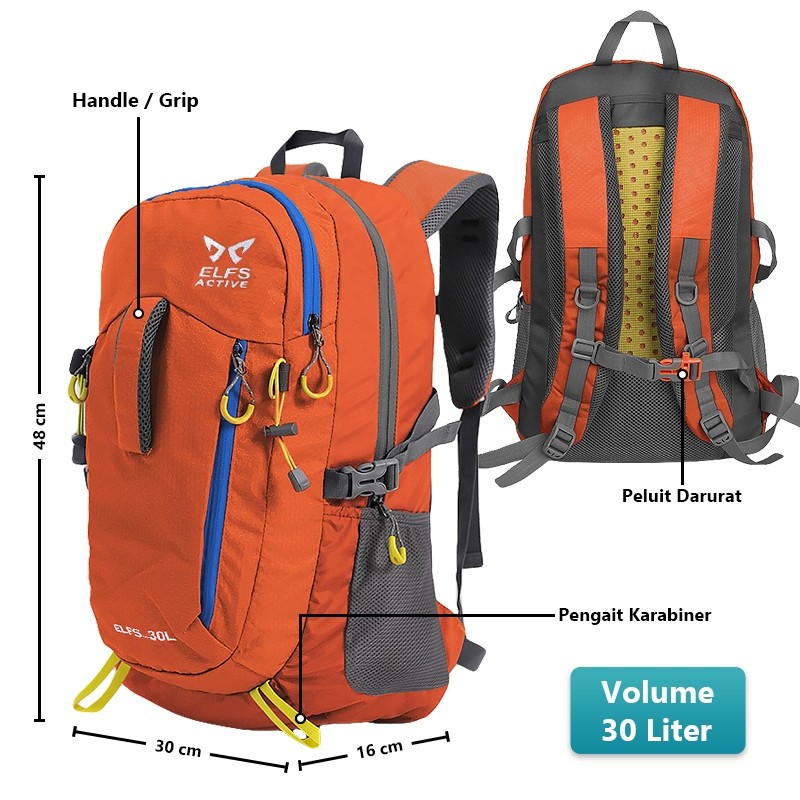 ELFS ACTIVE Tas Gunung Carrier Ransel 30L Tenteng Water Resistant Hiking Bag 3D Mesh FREE RAINCOVER