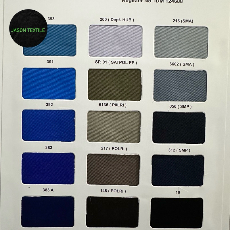 Cokelat Tua, Beige, Cokelat Muda, Hijau, Hijau Tosca, Putih, Hitam, Warna lain (katalog), Warna di Katalog, Warna katalog 1, Warna katalog 2, Warna katalog 3, Warna katalog 4, Warna katalog 5, Warna katalog 6, Buku Sample warna, Beli sample warna, Navy Muda 383A, Krem 022 Security Bj, Coklat Tua 150, Baby Blue 330, Biru Denim 6908, Hijau Lumut 528, Washed Denim 329, Orange Tua 809, Biru Abu 393, Biru 391, Biru 392, Biru BCA 383, Abu 200 dep hub, Satpol PP, 6136 polri, 217 polri, 148 polri, Abu SMA 216, Abu SMA 6602, Navy Smp 050, Navy Donker SMP 312, Putih Tulang 601, Krem muda 603, Orange Jingga 618, Orange Jeruk 714, Krem 600, Kuning Cerah 660, Kuning 619, Coklat 702, Merah Darah 721, Merah Bendera 722, Merah SD 7996, Maroon Burgundy 7966, 026 krem, 151 dept kes, 286 SMA, 229 SMA, 229A SMA, Abu 246, Abu 900, Pink 075, 118 beige, 146 khaki, 035 Abu Hitam, 337 Satpam, Kunyit Mustard 339, 171 Atasan Pramuka, 015 Bawahan Pramuka, Merah SD 726, 128 Bawahan Pramuka, Hijau Stabilo 513, 569 Hijau Muda, 574 Hijau tua, 532 Hijau Madrasa MI, 544 Hijau lumut, 1678 Kejaksaan, PKK 527, 509 hansip, Hansip 508, 548 TNI, 132 Khaki, Pemda 032, 192 Coklat, 576 pramuka bawahan, 6650 Coklat, 715, Ungu Muda 394, Ungu Tua 389, Ungu 388, Biru 708, Biru langit 851, Jasa marga 327, Jasa marga 328, Biru parkir 321, Biru parkir 807, Hijau Turkish 551, Hijau Tosca 550, Hijau daun muda 536, Hijau daun tua 705, Hijau 531, Hitam Pekat, Putih Bersih