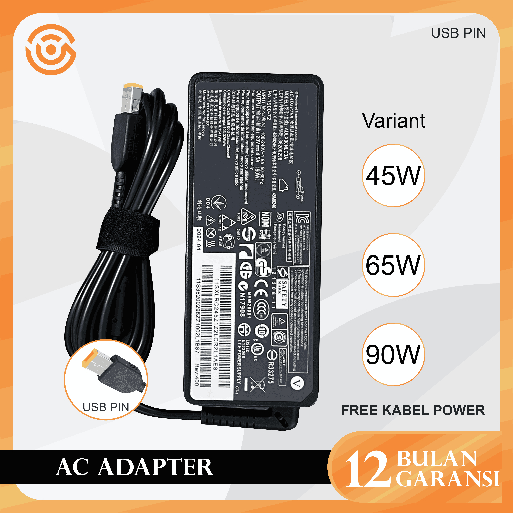 Voc Adaptor Charger Laptop ThinkPad Ideapad Yoga Slim 20V Output 45W/65W/90W Konektor USB Kuning Jarum Tengah