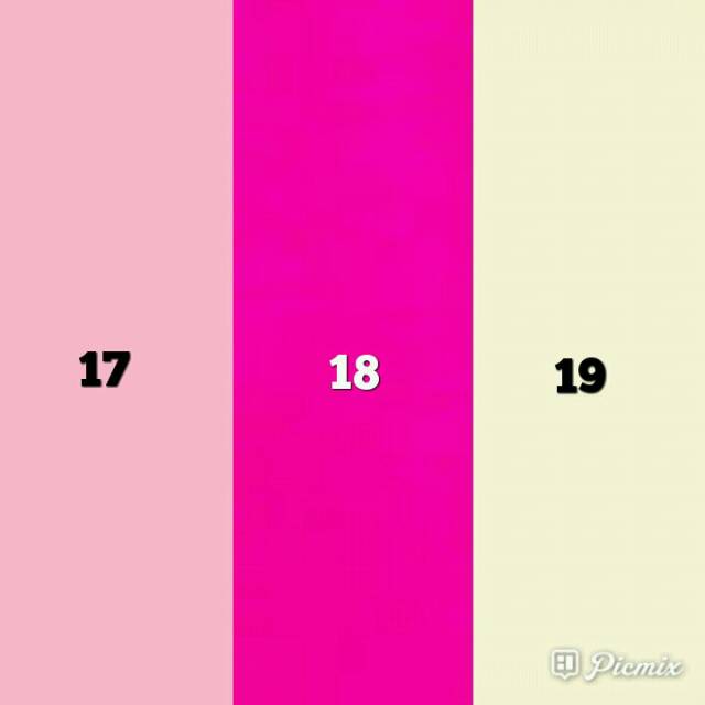 Biru muda, Biru elektrik, Hitam, Merah, Hijau lumut, Hijau tua, Hijau muda, Ungu tua, Ungu muda, Putih bersih, Putih gading, Abu2, Oranye, Kuning, Cokelat tua, Cokelat medium, Cokelat muda, Pink tua, Pink muda, Salem, Coklat kopi susu, Coklat Sandy muda, Per 3 meter