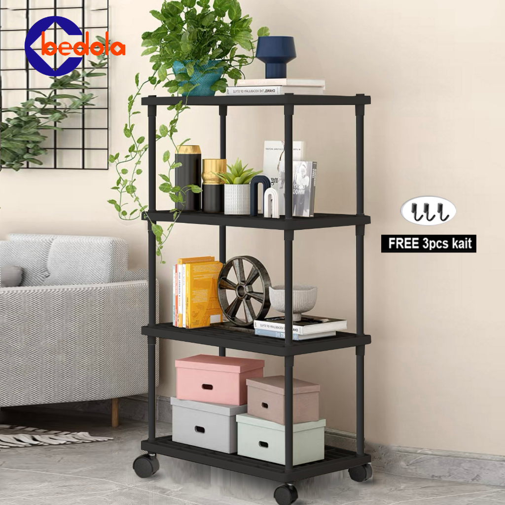 Rak dapur plastik acsthetic rak susun rak serbaguna rak panci putih 4 layer dengan roda free 3 kait