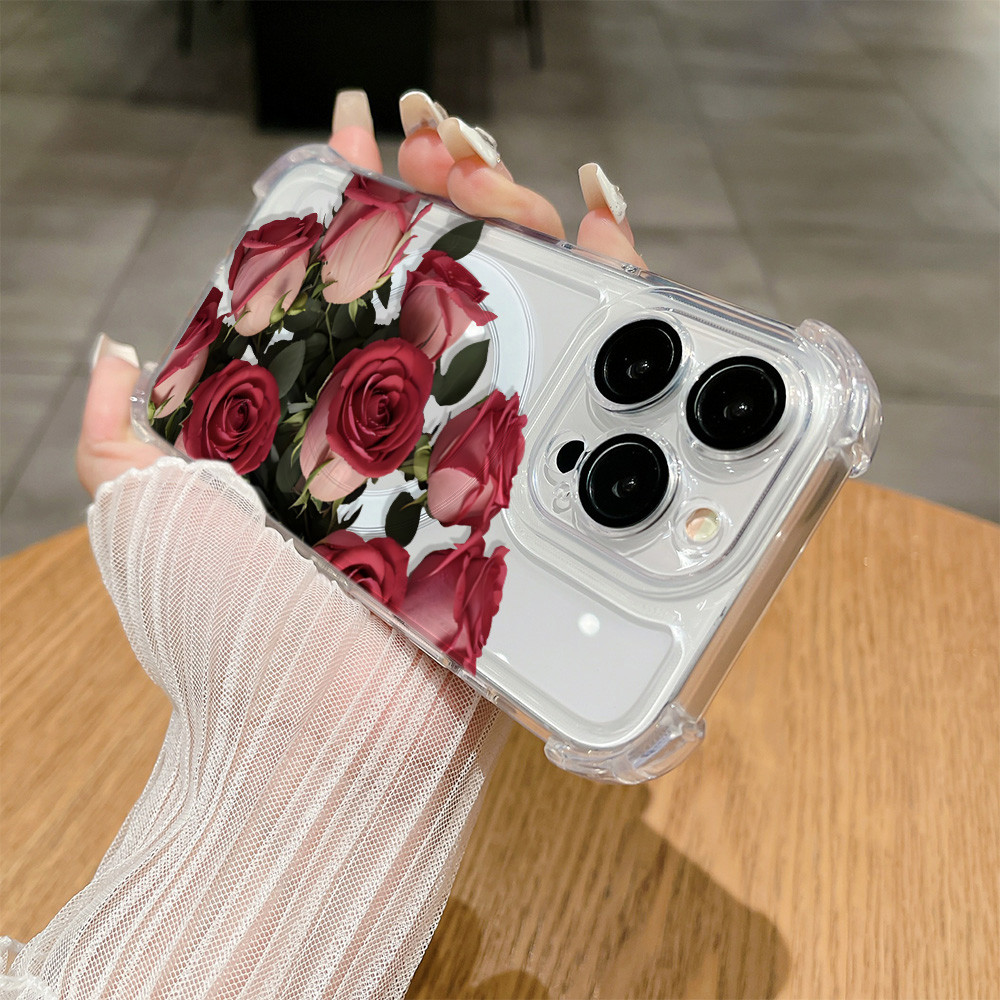 MAXCOBBER Beautiful Roses Case Magsafe Acrylic Airbag Clearcase Anti Kuning - Anti Shock-proof Casing Pro Camera for iP