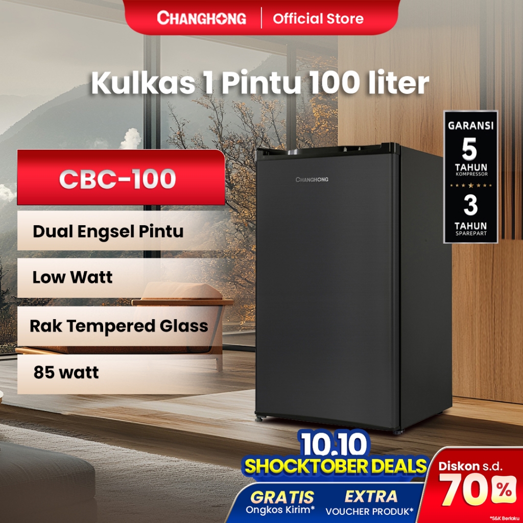 [Star] Changhong Kulkas 1 pintu (Refrigerator) Lemari Es Kapasitas 100 Liter – Black CBC 100 (Semi Auto-Defrost ) (Ajustable Do