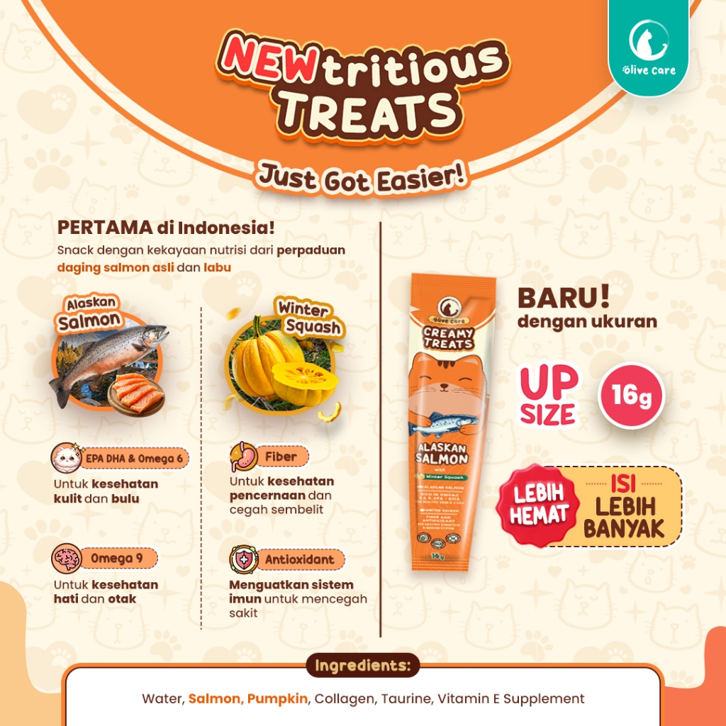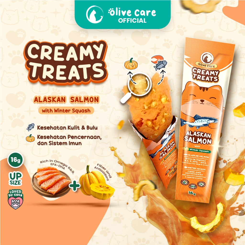 OliveCareSINGLECREAMYTREATS16grUPSIZEAlaskanSalmon&WinterSquash,SnackCemilanKucingdenganDagingSalmonAsli&LabuuntukPertum