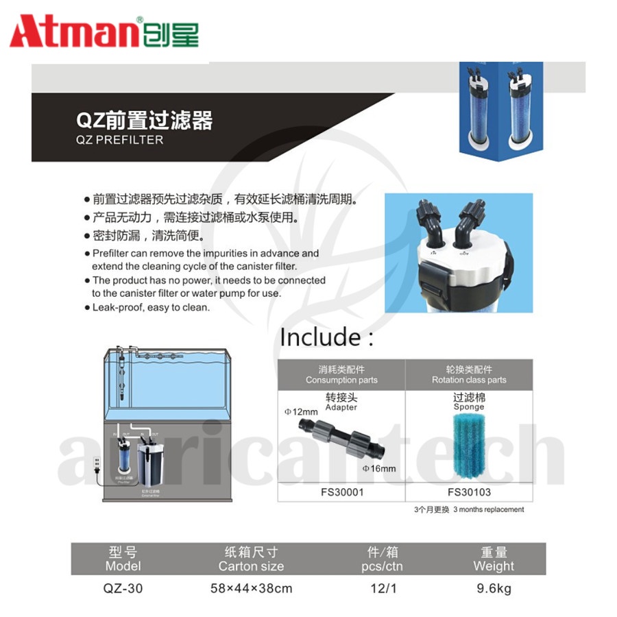 Atman QZ-30 Pre Filter Canister untuk AT3335 S3336S 3337S 3338S 3339S