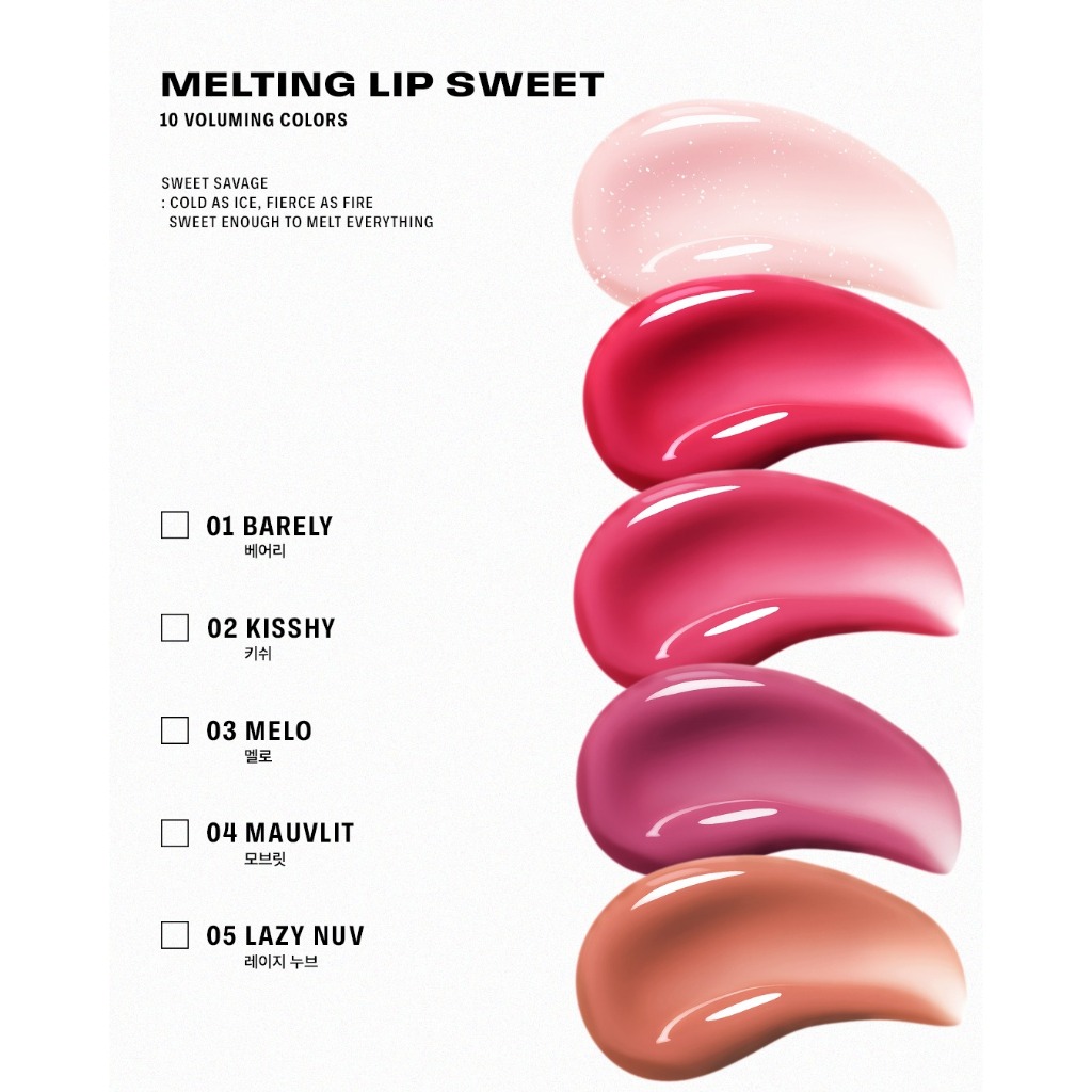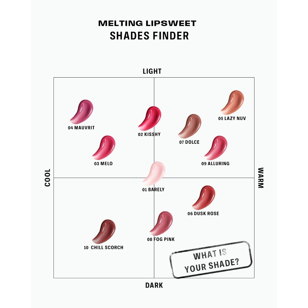 01 Barely, 02 Kisshy, 03 Melo, 04 Mauvrit, 05 Lazy Nuv, 06 Dusk Rose, 07 Dolce, 08 Fog Pink, 09 Alluring, 10 Chill Scorch