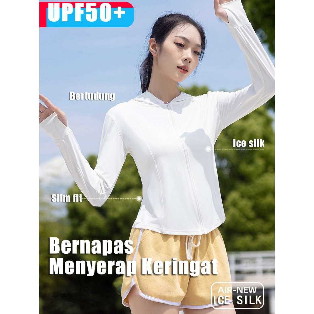 Jaket Sport Wanita Hoodie Lengan Panjang Anti UV Bahan Ice Silk Cepat Kering untuk Gym Running Yoga Outdoor & Sepeda