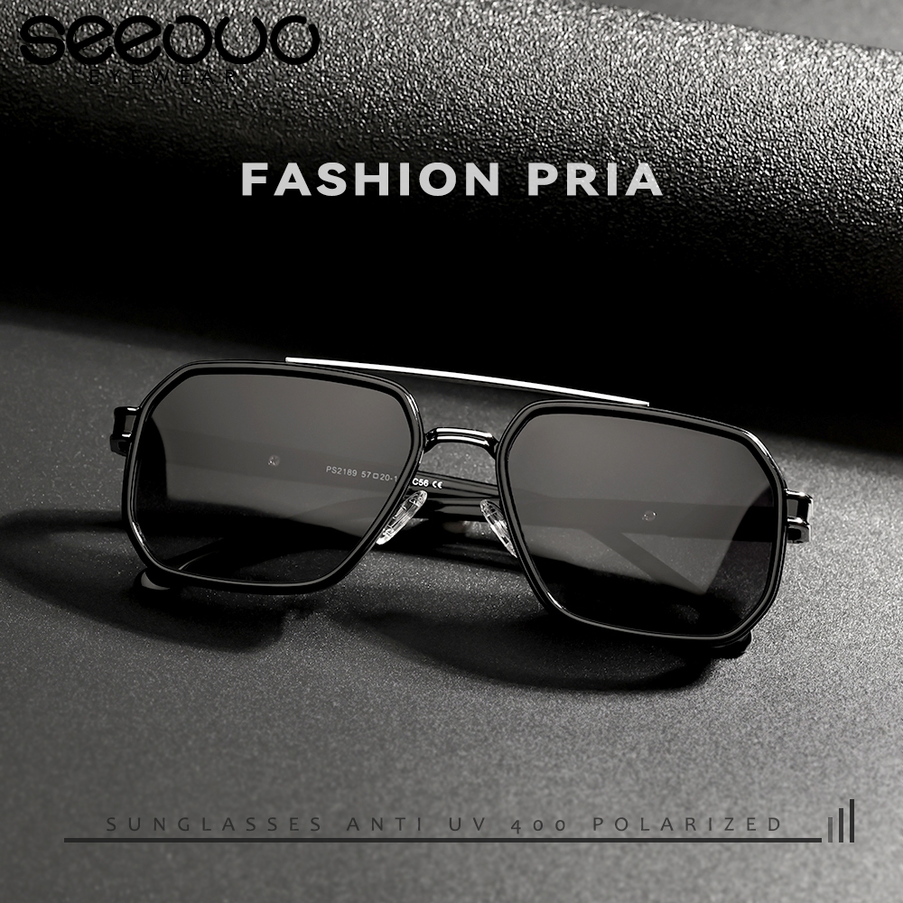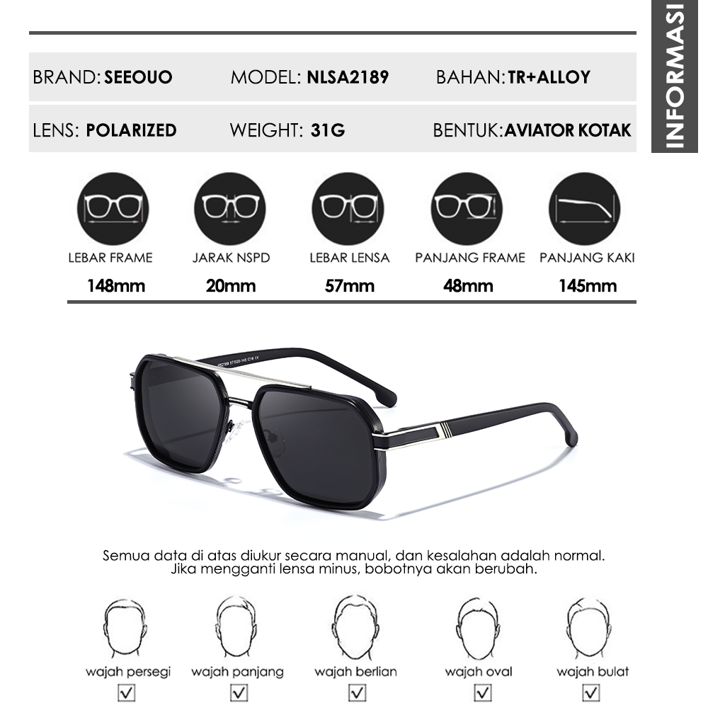 Seeouo Sunglasses Polarized Model Aviator Kotak Fashion Pria Elegan Alloy+TR90 Kokoh Kacamata Hitam Anti UV 400 Anti Silau 2189
