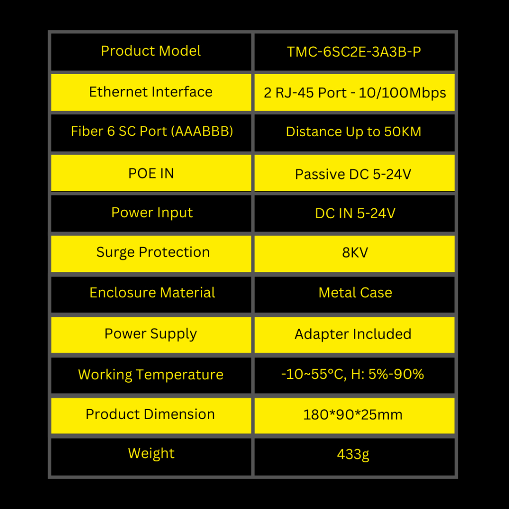 Tarmoc TMC-6SC2E-3A3B-P | Media Converter Switch 6 FO 2 LAN 10/100Mbps POE IN 5-24V