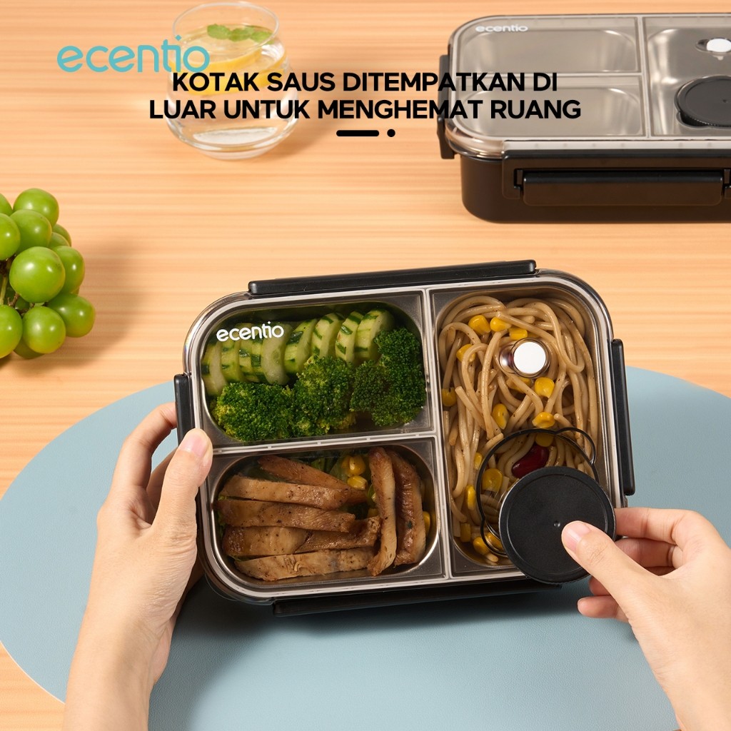 ecentio lunch box stainless 800ml sekat 3 dengan sendok sumpit free kotak sauce kecil