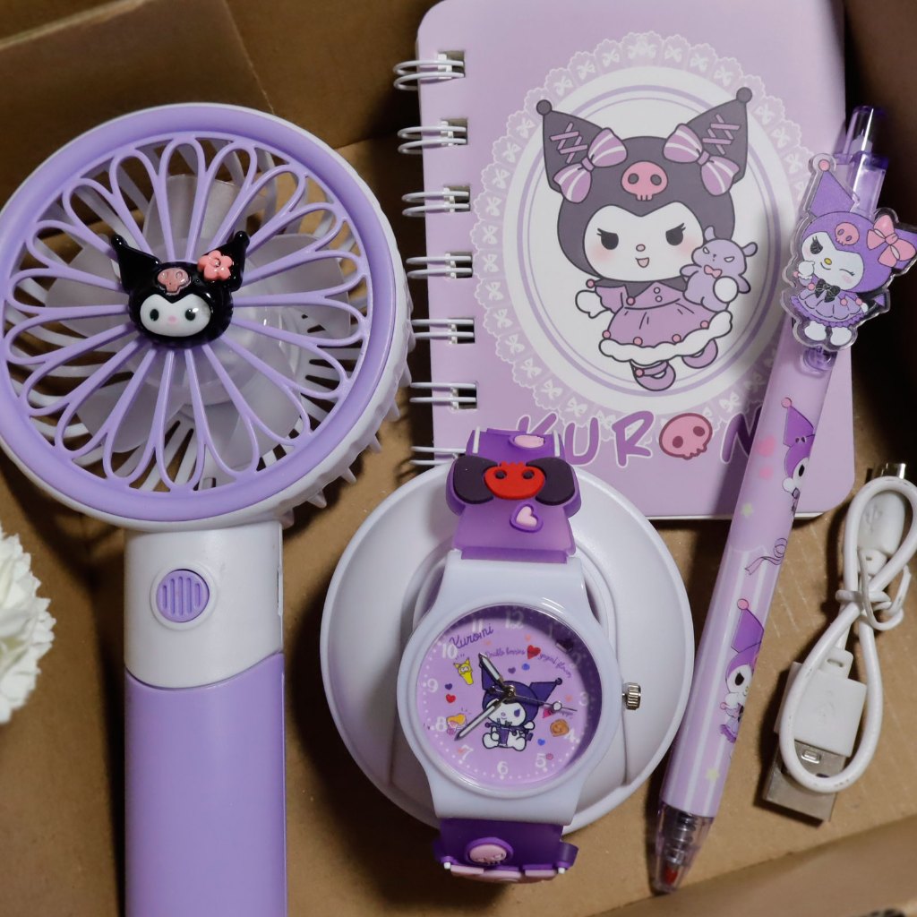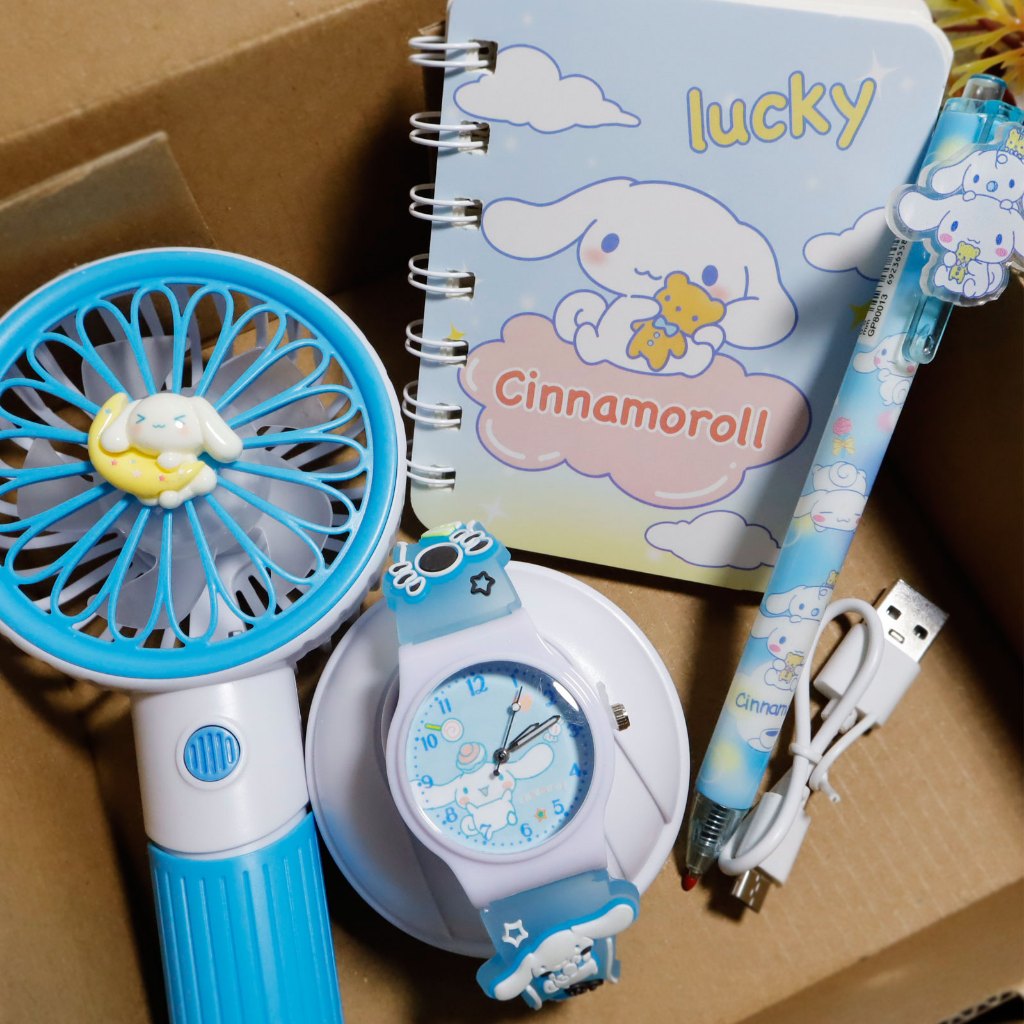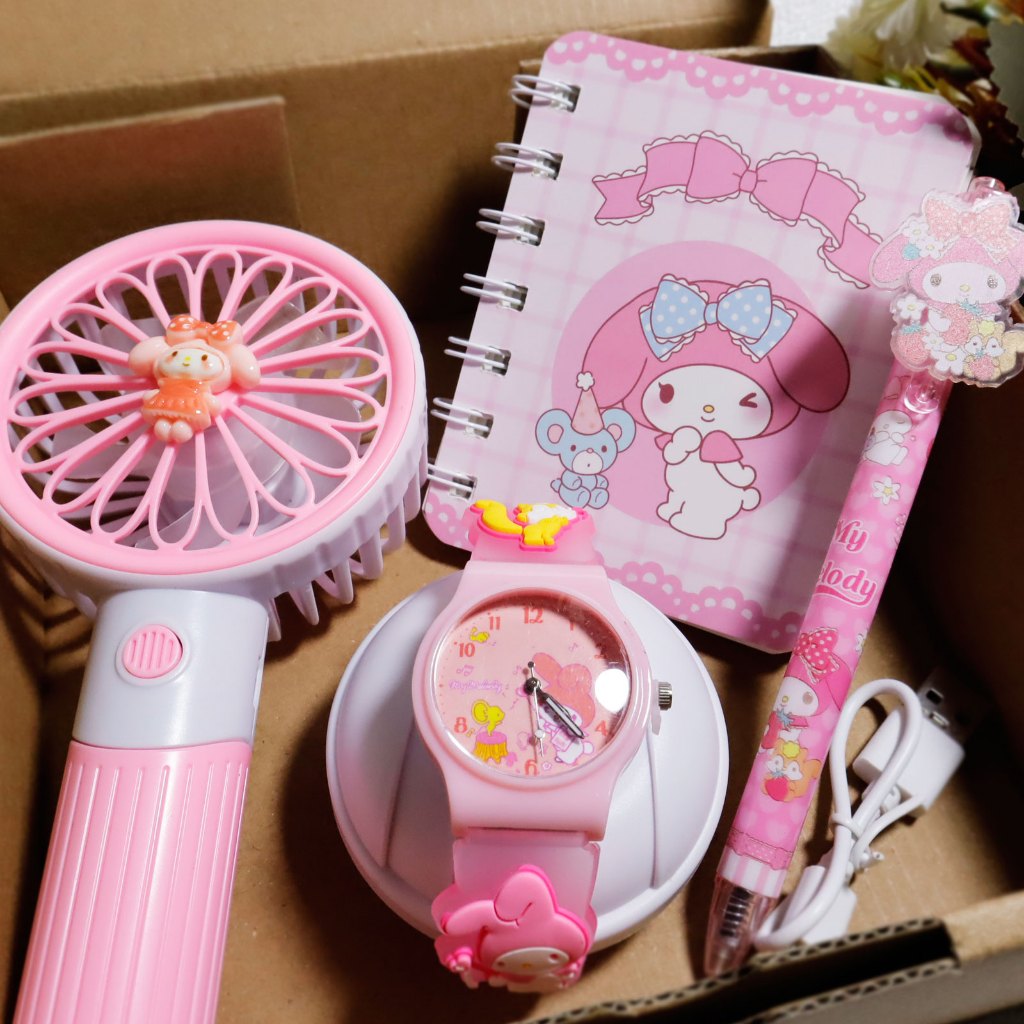 Calvina Kids - Bundling jam Tangan, Kipas Mini, Paket Kado Kuromi, Cinnamoroll, Melody, Hello Kitty