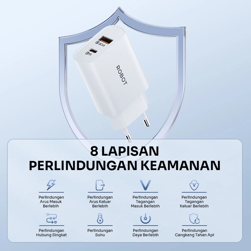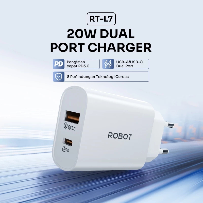ROBOT Adaptor Charger Fast Charging 20W USB-A-USB-C Dual Port Power Delivery 3.0 Type C RT-L7 - Garansi 1 Tahun