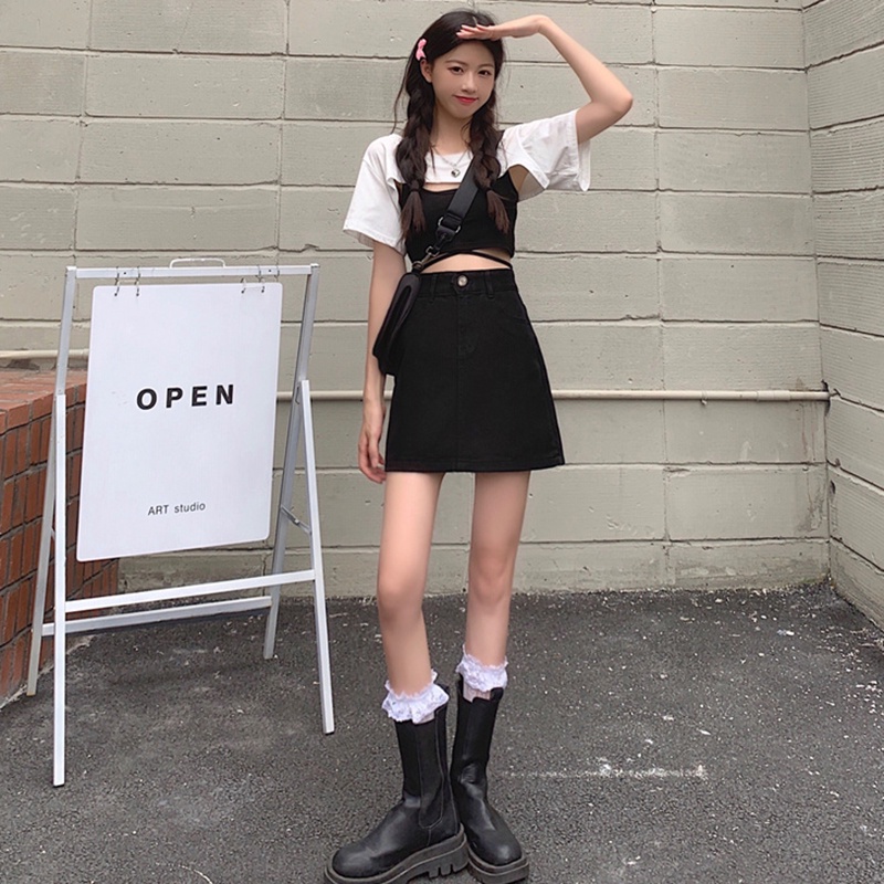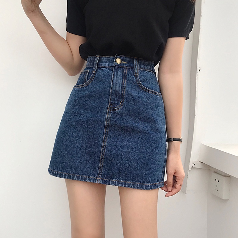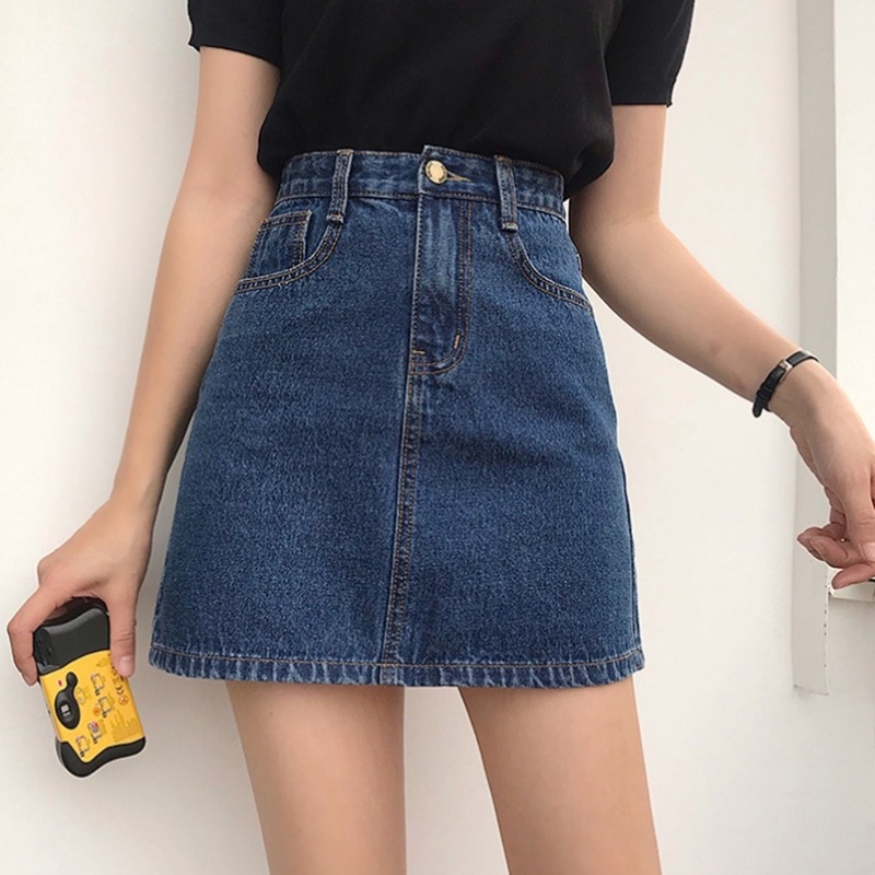 ROK JEANS WANITA ROK JEANS WANITA ROK JEANS WANITA Newlan Dq002-2 Rok Jeans Pendek A-Line Rok Denim Skirt Pinggang Tingg