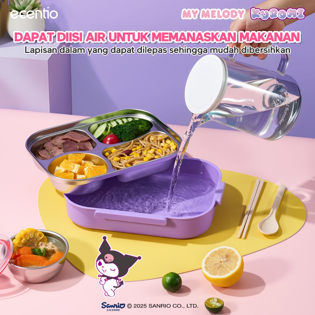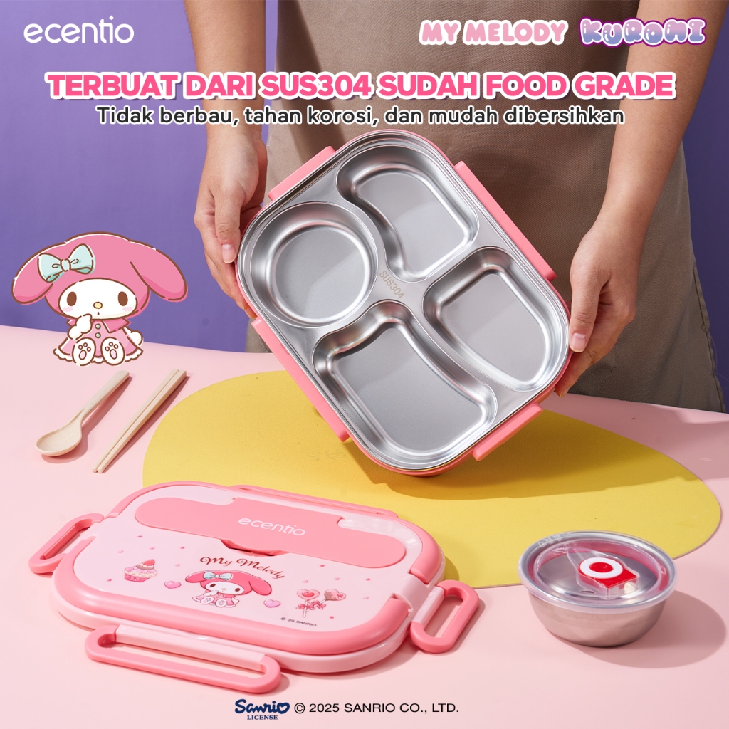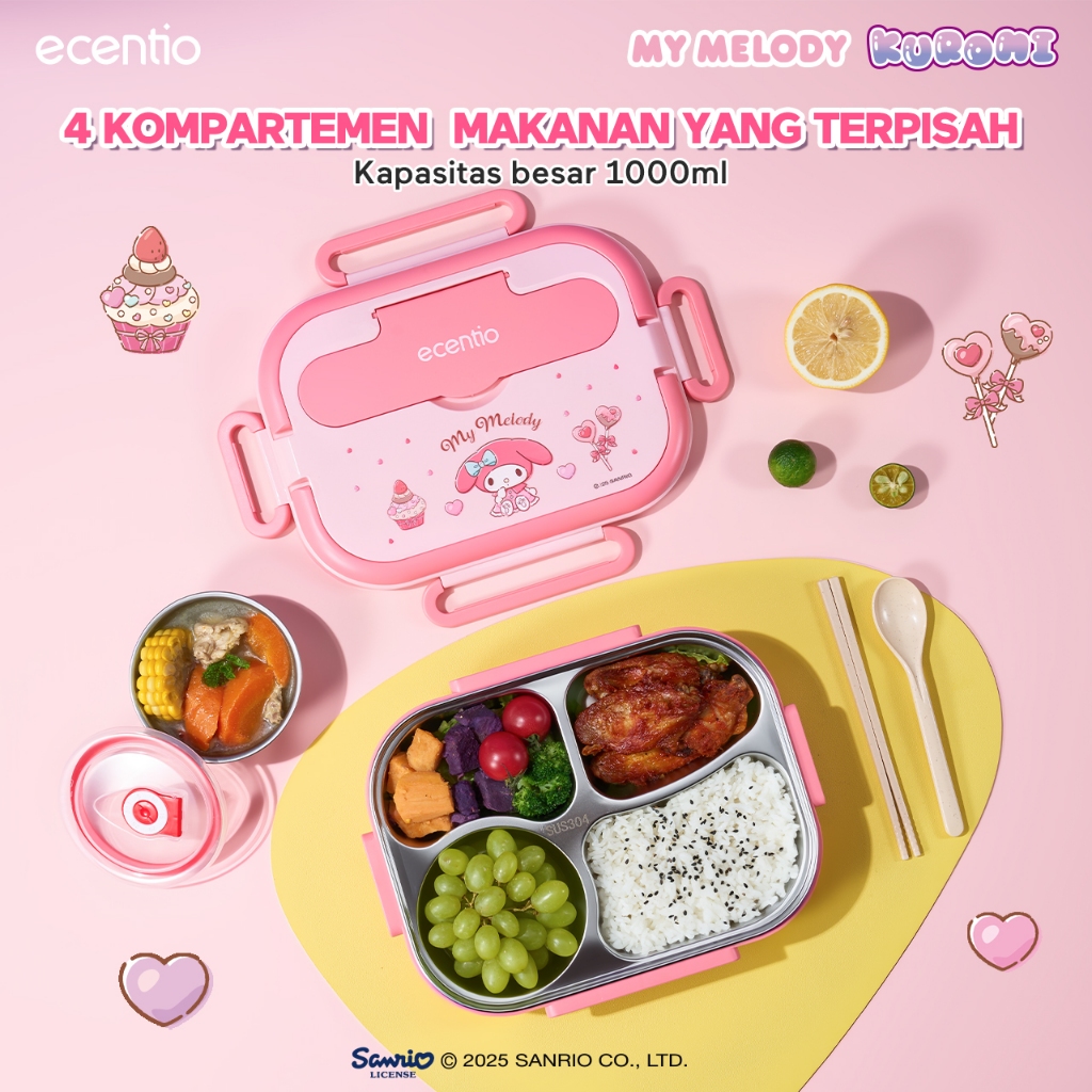 【Seri Sanrio Resmi】ecentio Kotak bekal 304 stainless steel 4 Sekat 1000ml Lunch box Bento Kapasitas besar Anti bocor Por