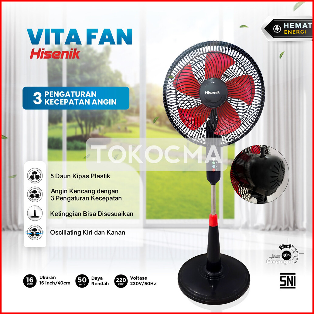 Hisenik Vita Fan Kipas Angin Berdiri 16inch Hks-16pl Stand Fan 5 Daun Kipas 3 Kecepatan Low Med High