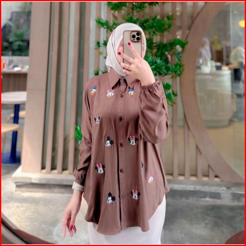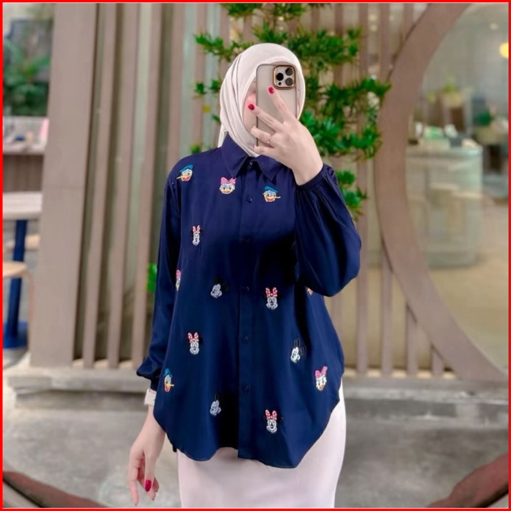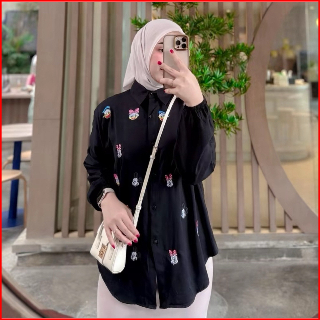 Kemeja Mickey Atasan Wanita Bordir Lucu Rayon Twill Polos Premium