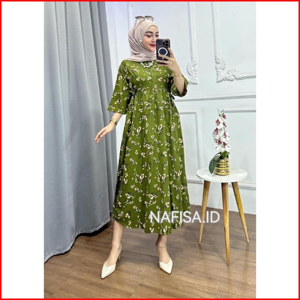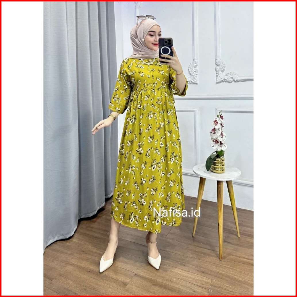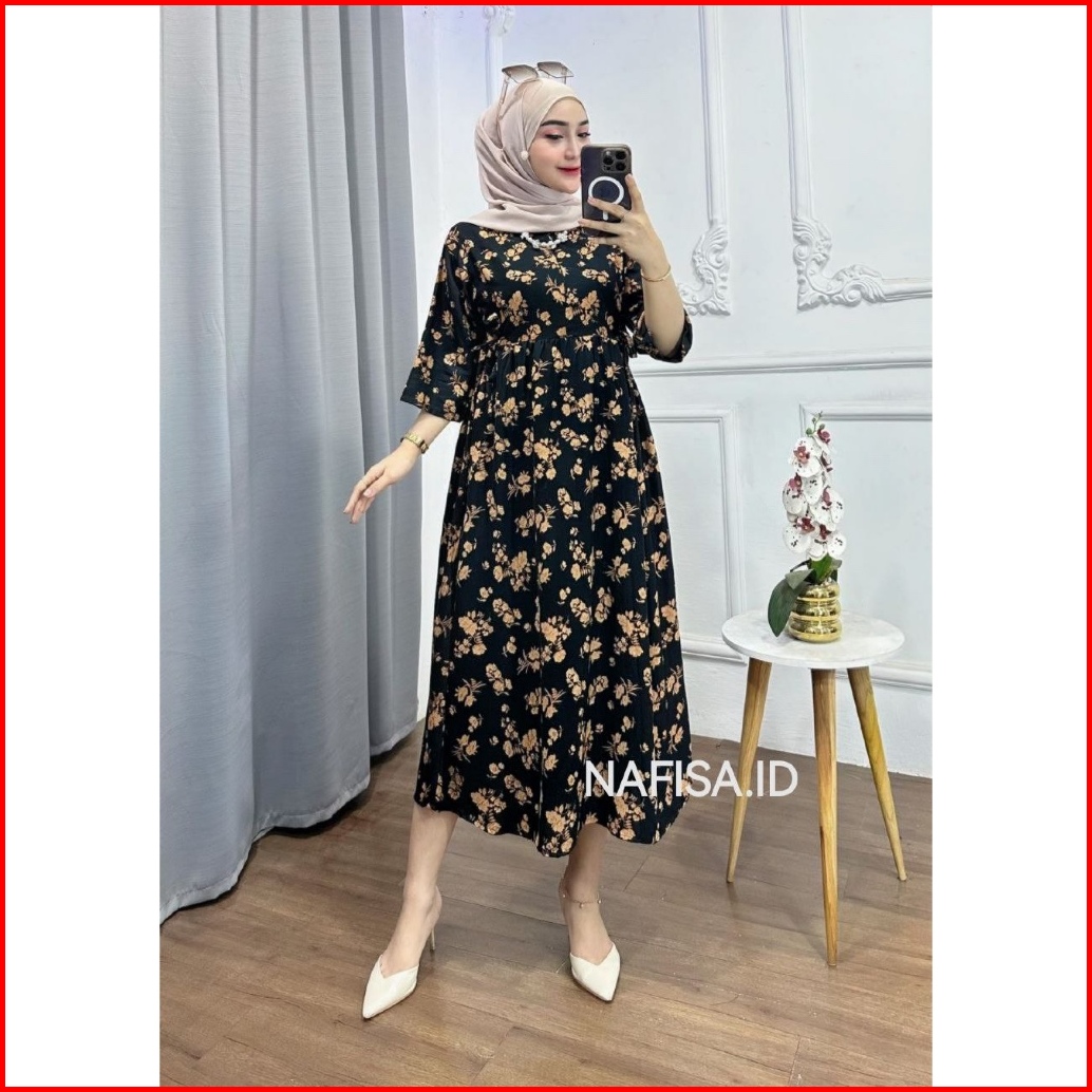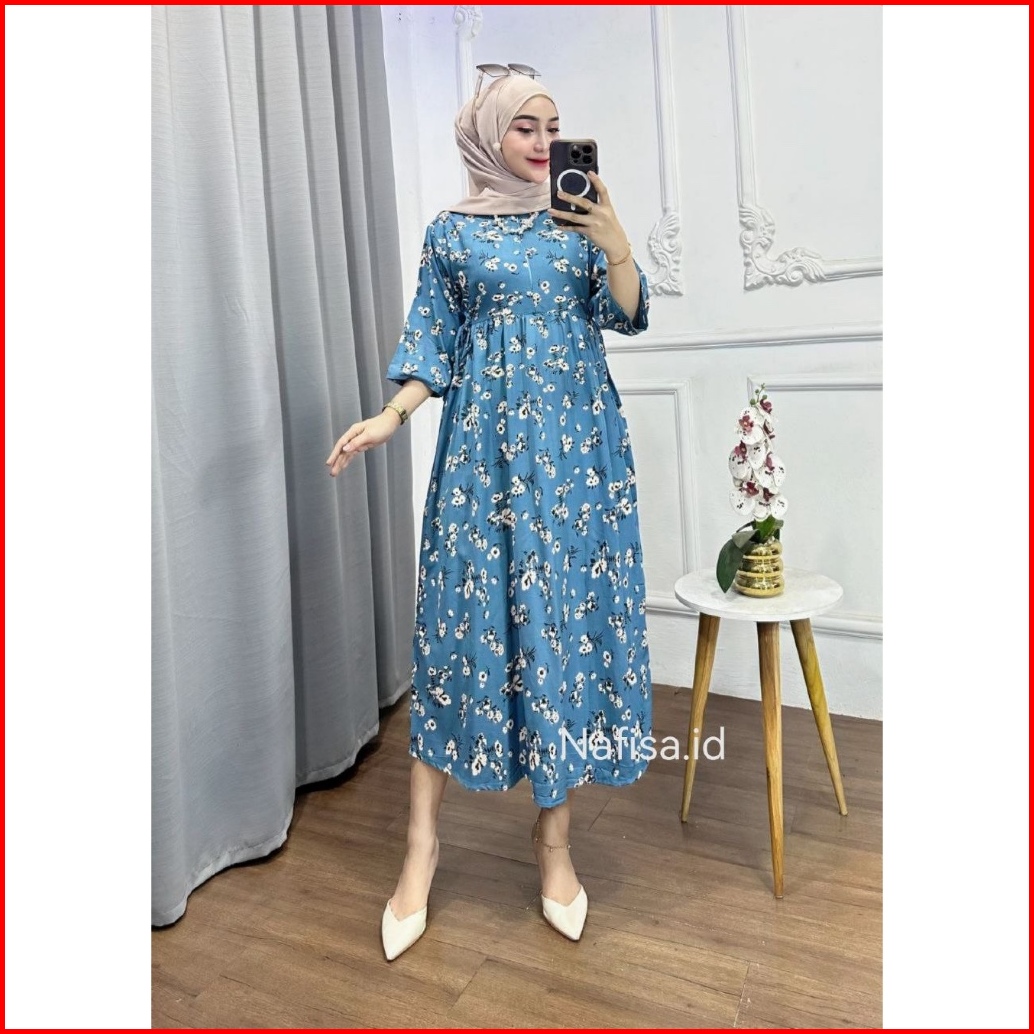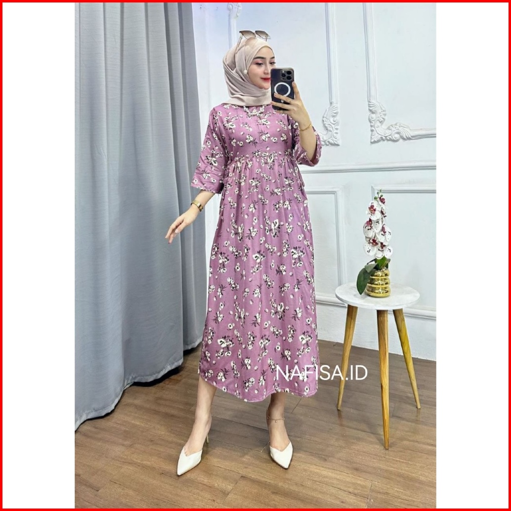 Midi Dress Flora Katun Rayon Motif Premium - Busui Friendly