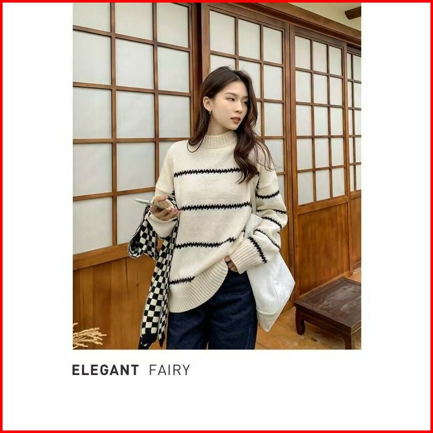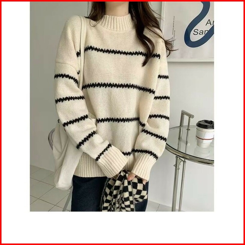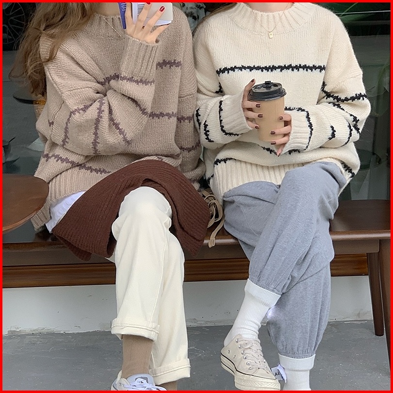 Clothesgallery Sweater Pullover Leher Bulat Wanita Baru Longgar Garis Korea Warna Kontras Sweater Lengan Panjang Trendi