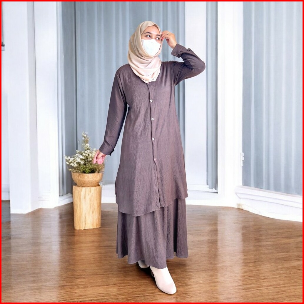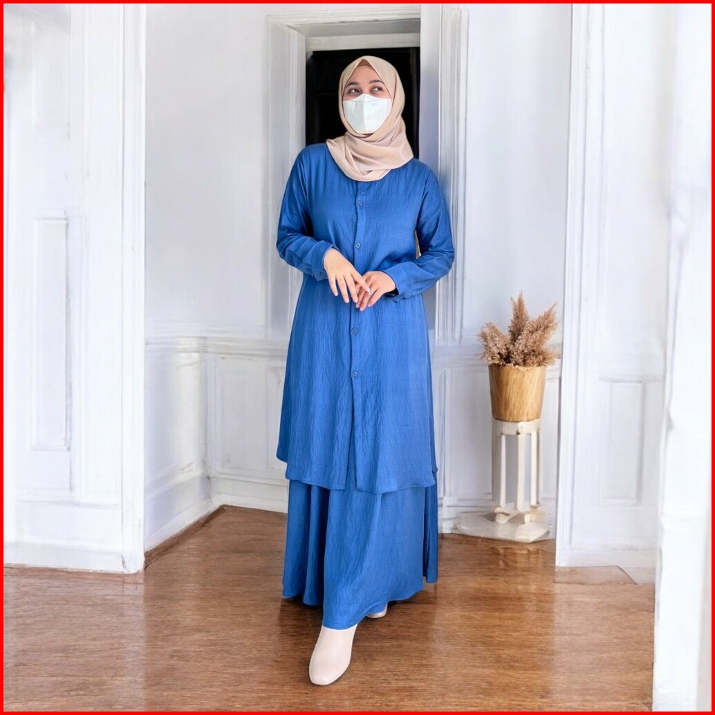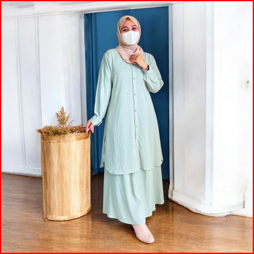 Keyla One Set Atasan Dan Bawahan Rok Bahan Linen Setelan Tunik Kancing Aktif Ootd Casual Wanita 2025