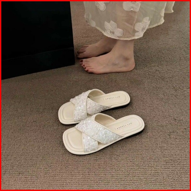 Payet Sandal Perak Menyeberang Satu Kata Musim Panas Busana Fashion Outwear Baru 2024 Wanita Senior Sepatu Wanita Pantai