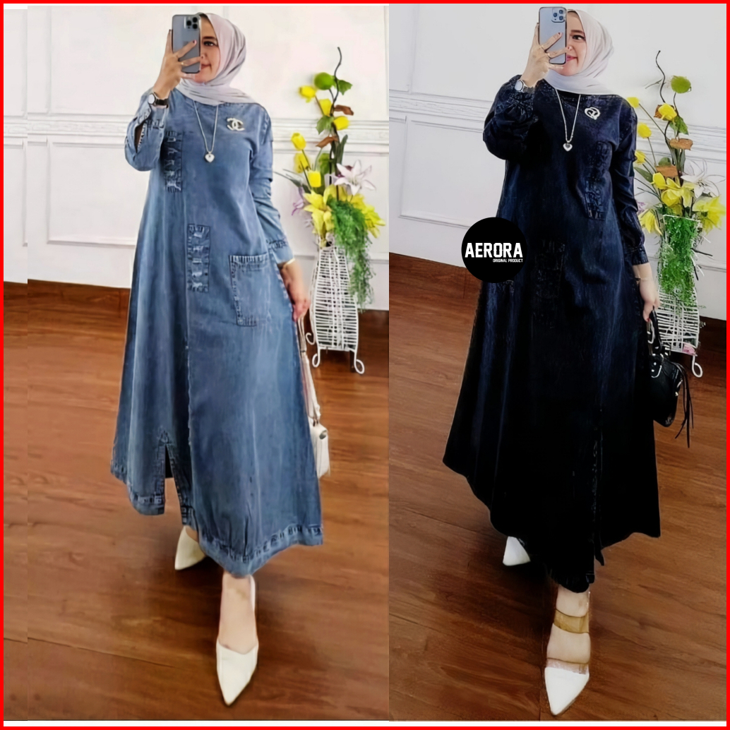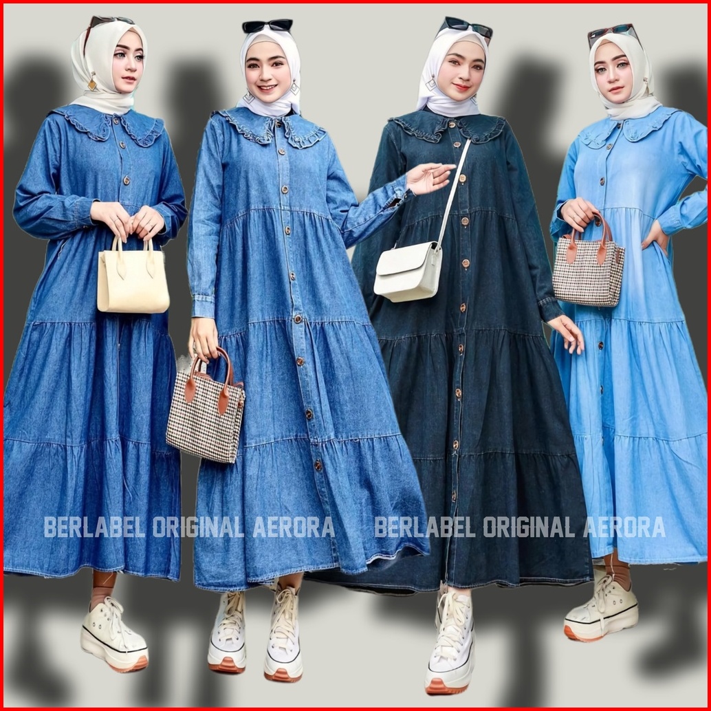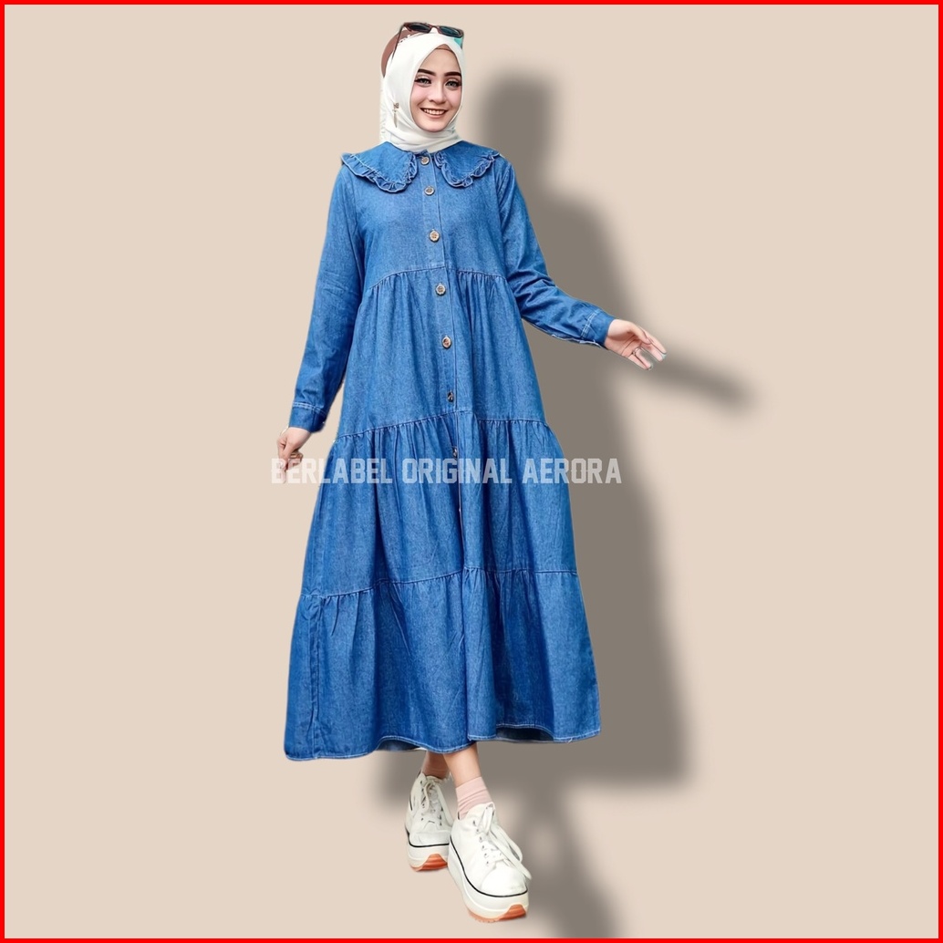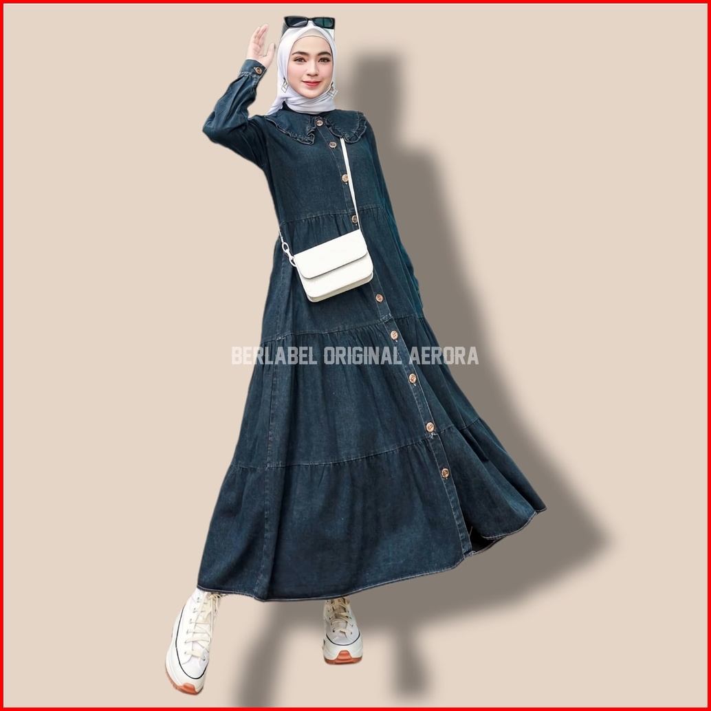 Aerora Kirana Midi Dress Dres Jeans Korea Muslim Korean Style Wanita Terbaru 2025 Busui Susun Premium Import Kekinian Ld