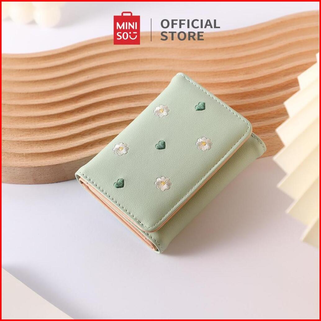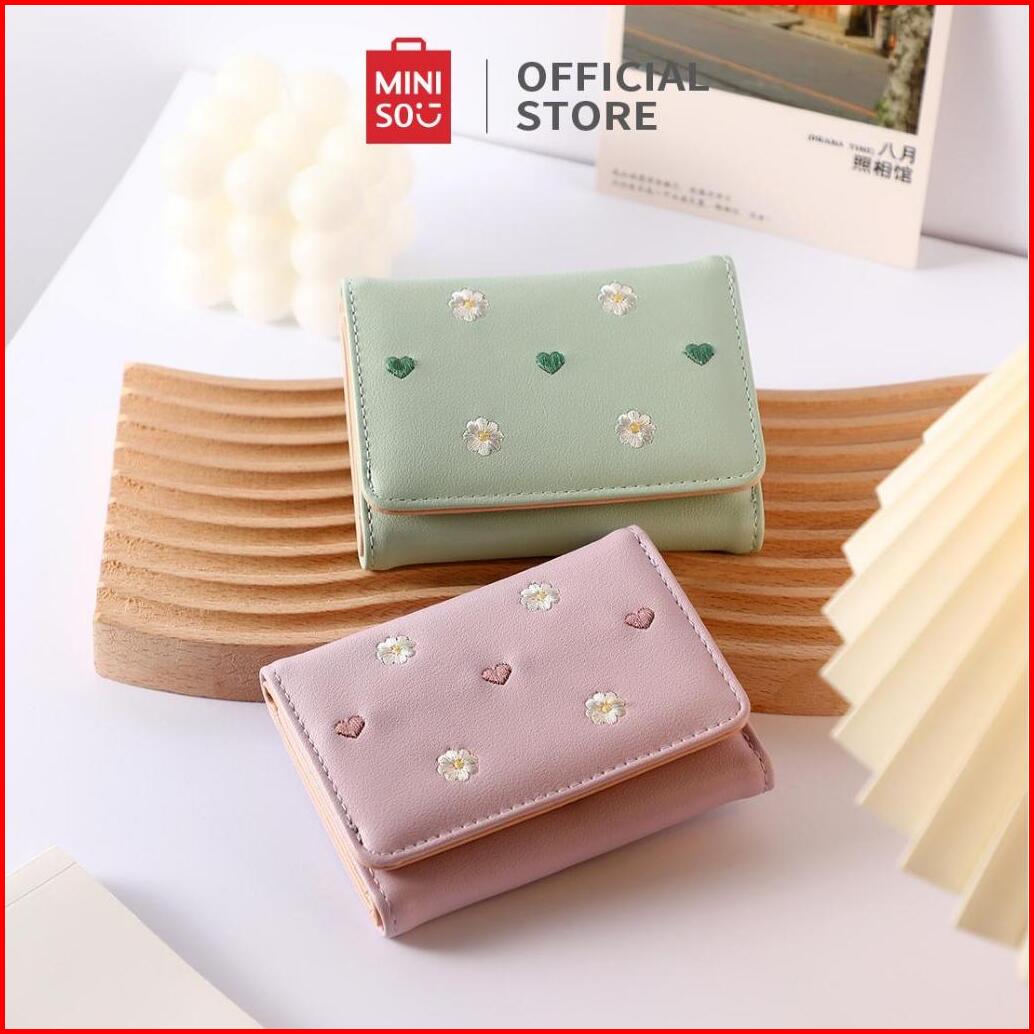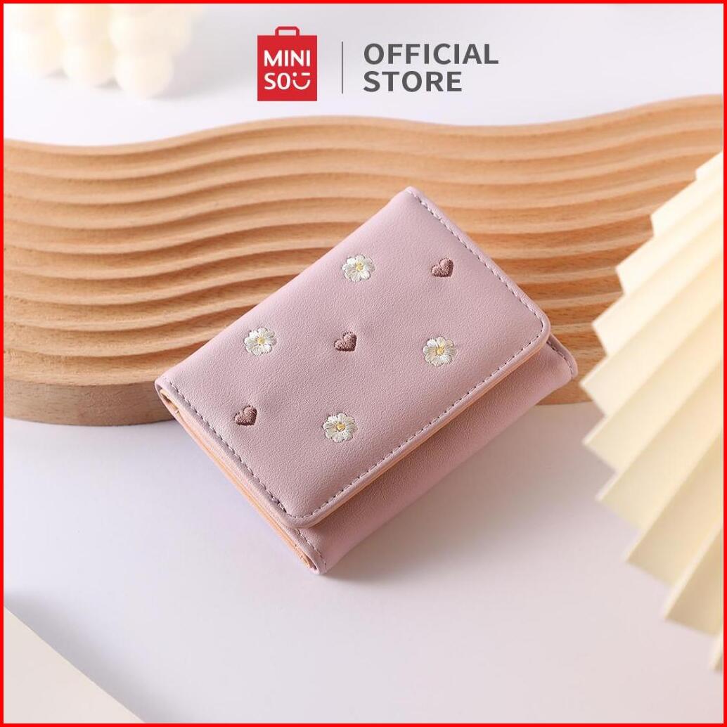 Miniso Dompet Wanita Tiga Lipat Motif Bordir Bunga Hati Bahan Awet Card Slot Banyak Ukuran Sedang