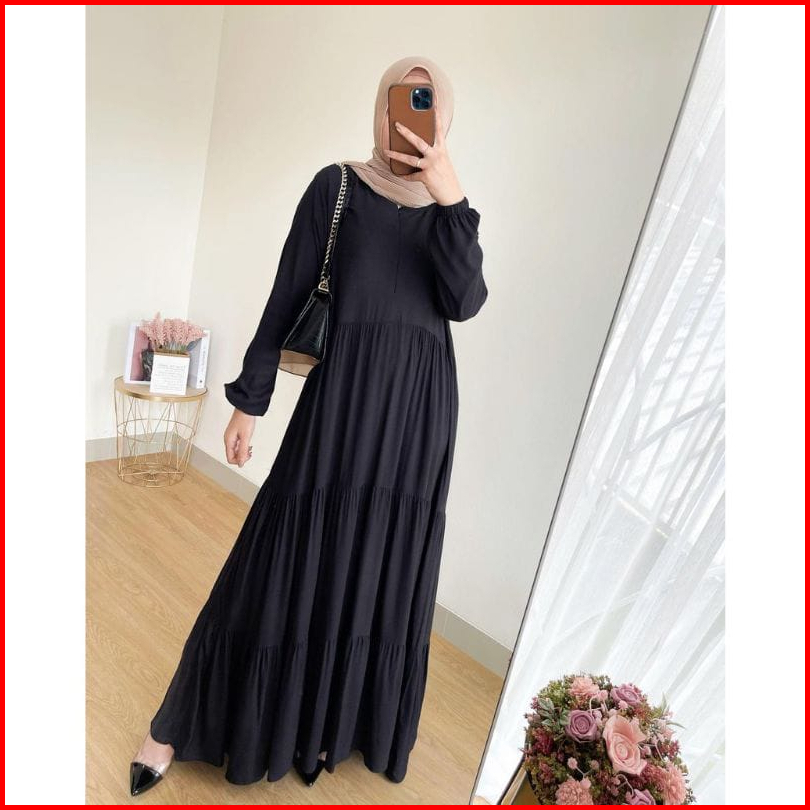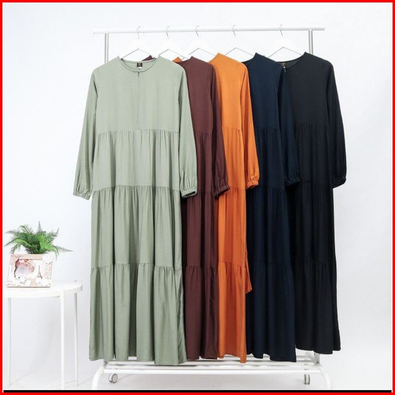 Dress Maxy Susun Tiga Rayon Twill Tebal Adem Jatuh