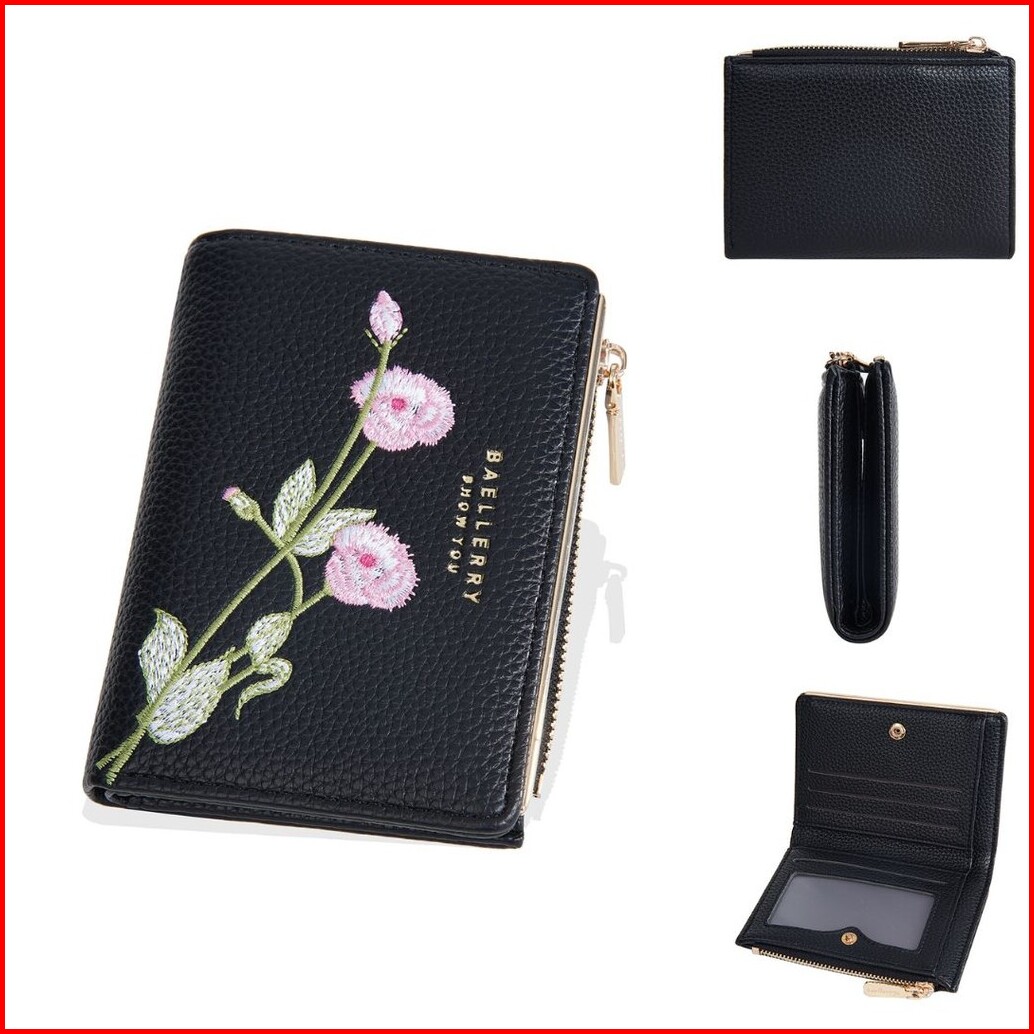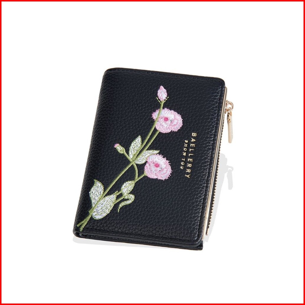 Dompet Wanita Lipat Kulit Katsui Wa1037b5 Hitam Cantik Motif Bunga Branded Elegan Mini Simple Baru