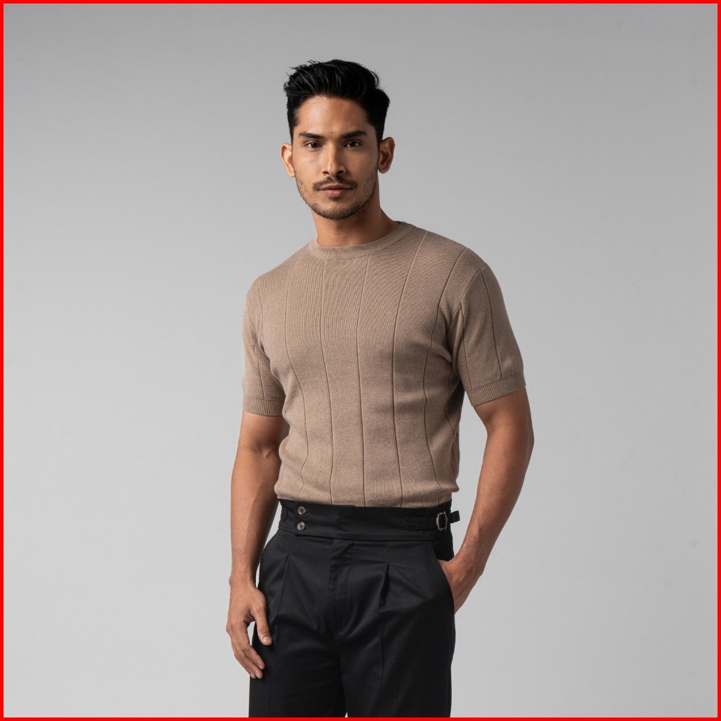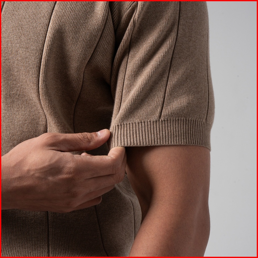 Vengoz Kaos Rajut Pria Premium - Mens Striped Knitted T-shirt Cotton Light Brown Ss