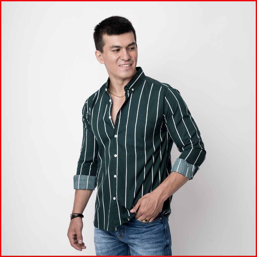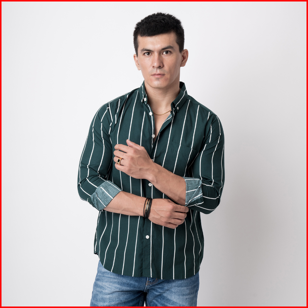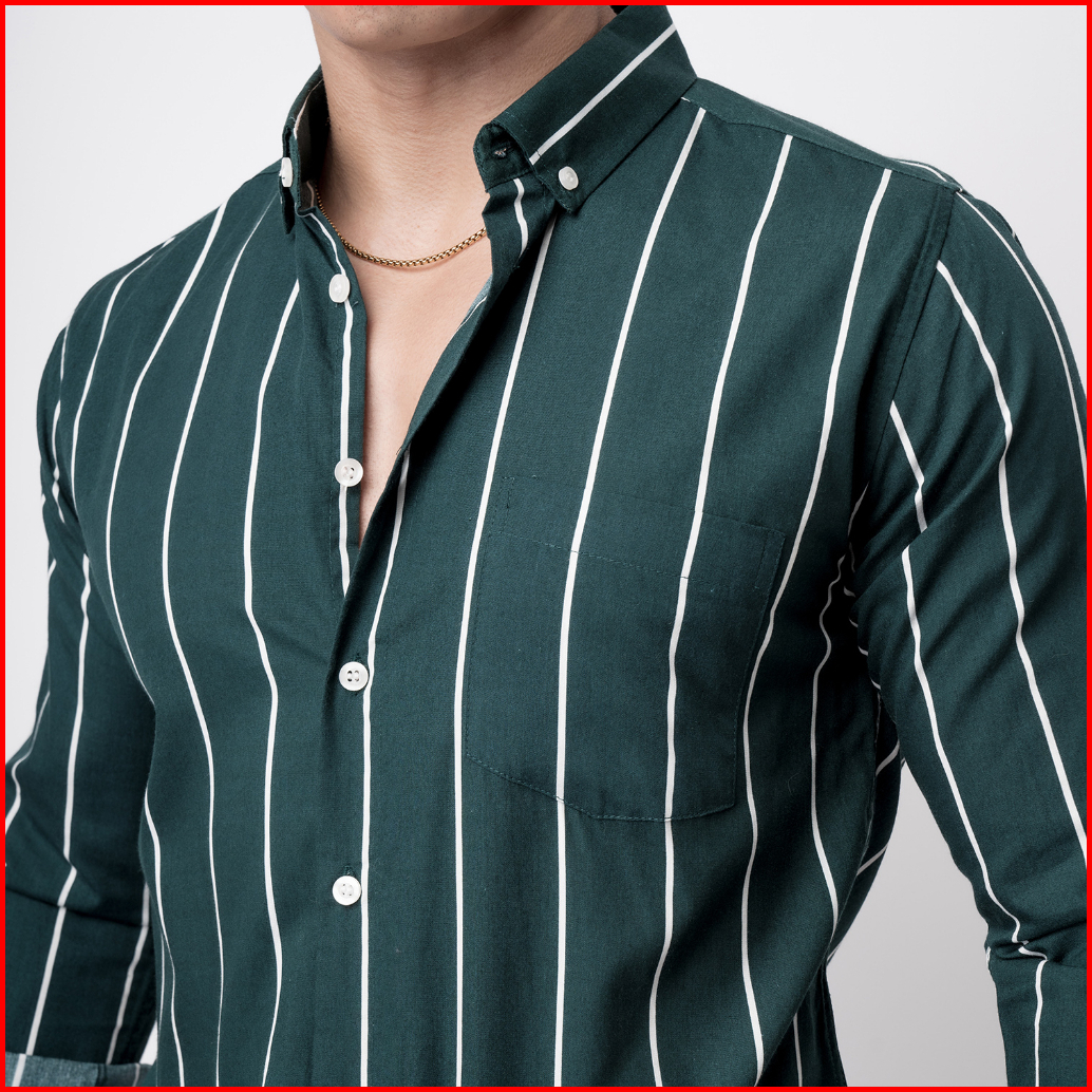 Vengoz Atasan Kemeja Pria Slim Fit - Vicente Stripe Dark Green Ls