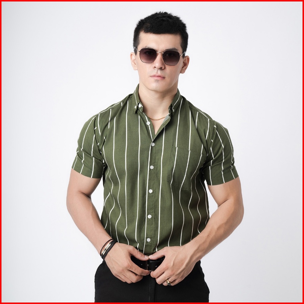 Vengoz Atasan Kemeja Pria Slim Fit - Vicente Stripe Army Green Ss