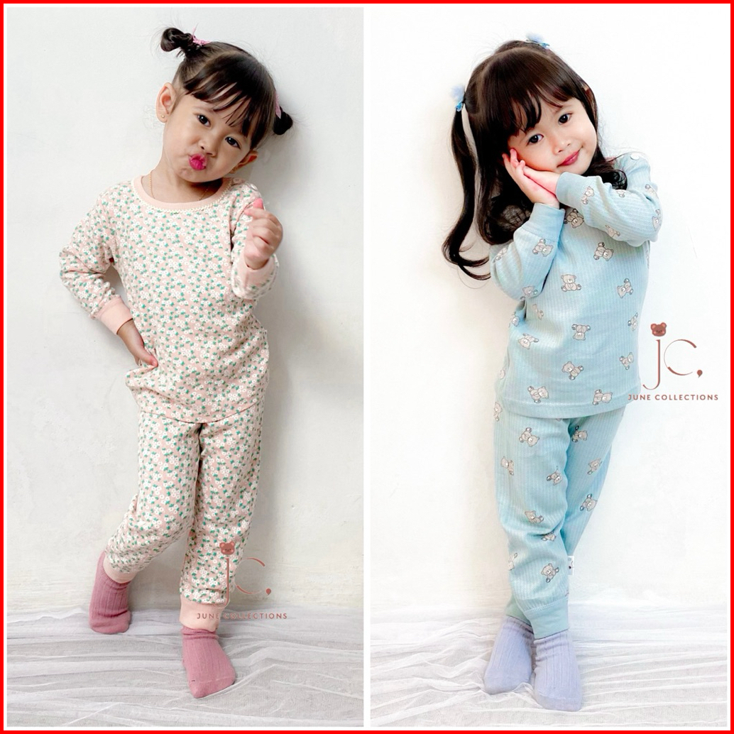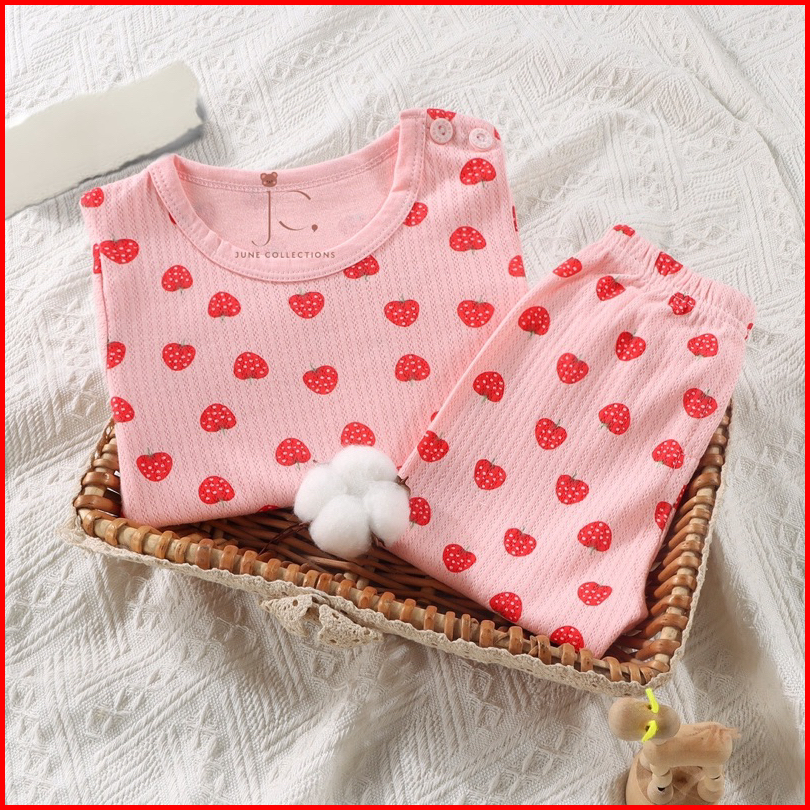 Junecollections Baju Tidur Anak Setelan Piyama Bayi Set Lengan Panjang Bahan Lembut Piyama Anak Motif Daun Pita Cherry B