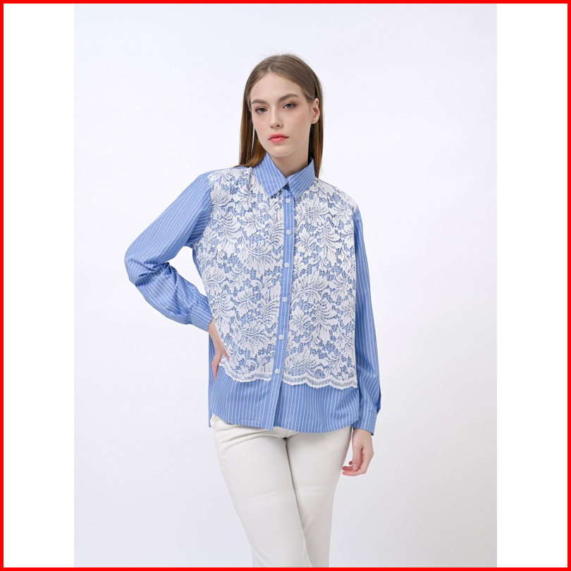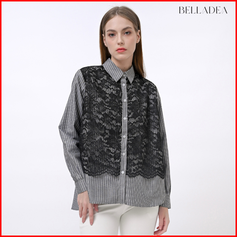 Belladea - Leisha Shirt Stripe Lace Kemeja Blouse Renda Wanita Daily Wear