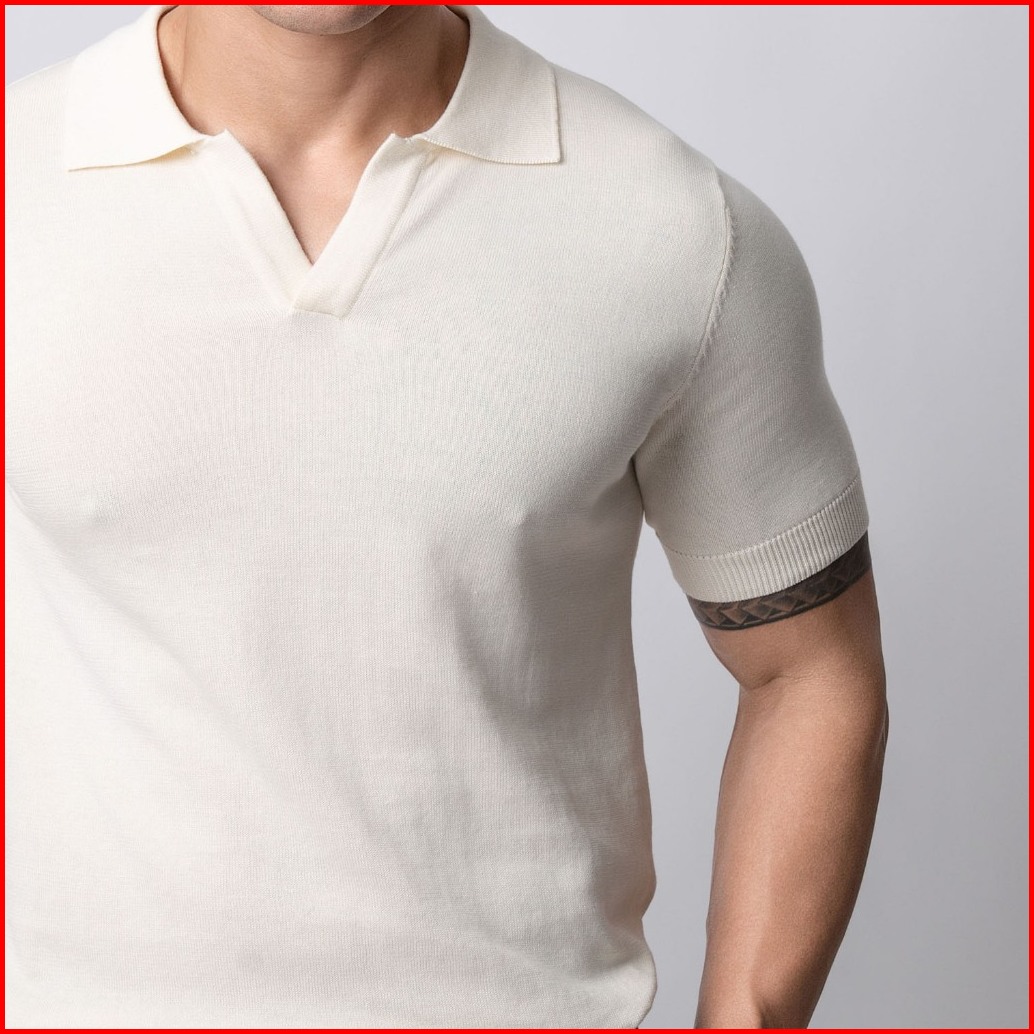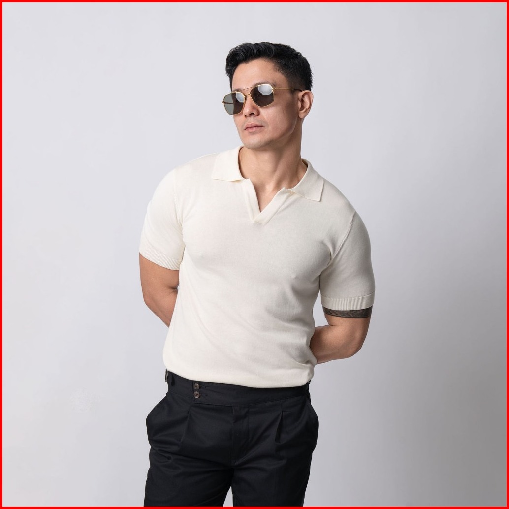 Vengoz Polo Shirt Rajut Pria - Mens Polo Shirts Basic Vneck Knitted Off White