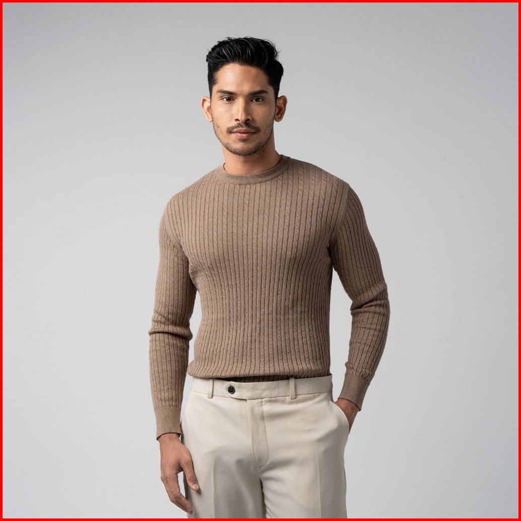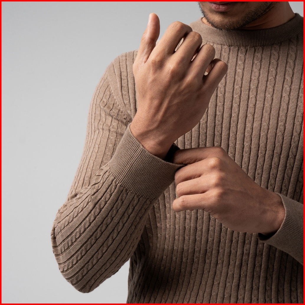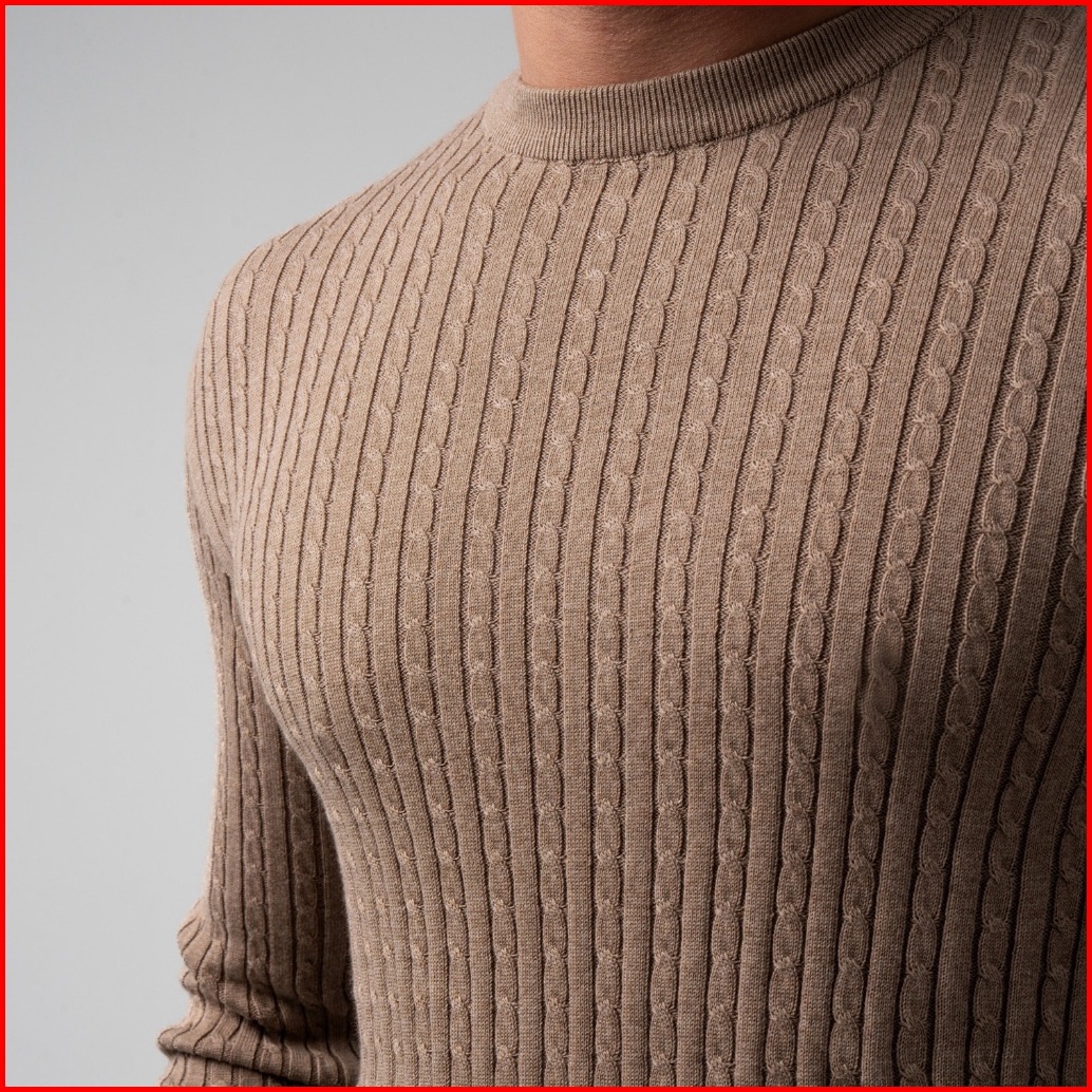 Vengoz Sweater Rajut Pria Premium - Mens Cable Knit Cotton Sweater Light Brown Ls