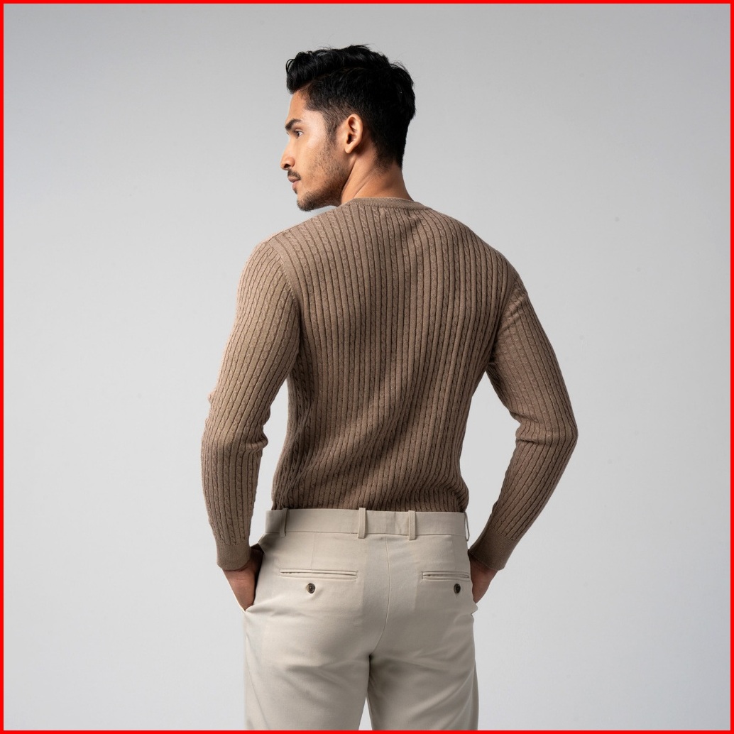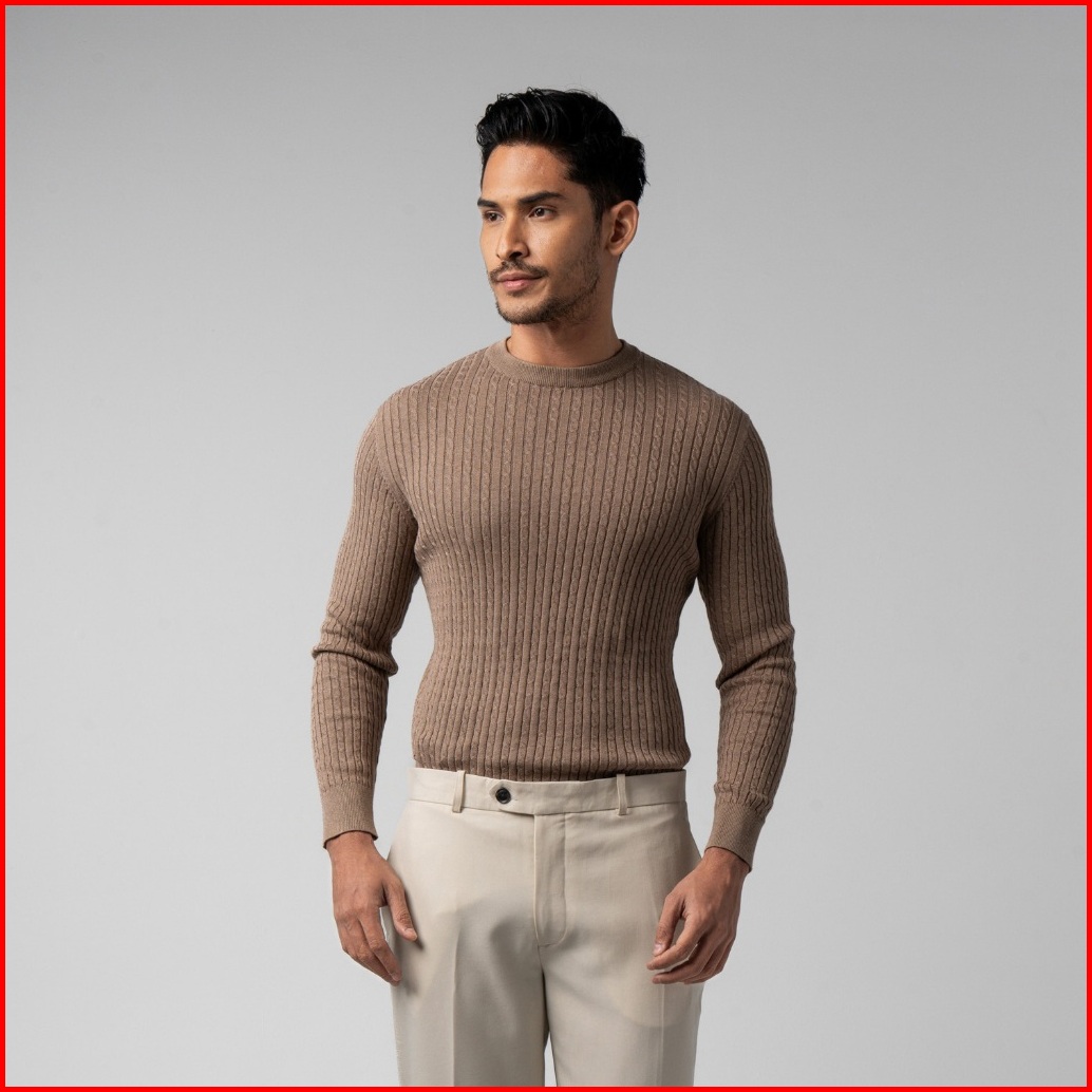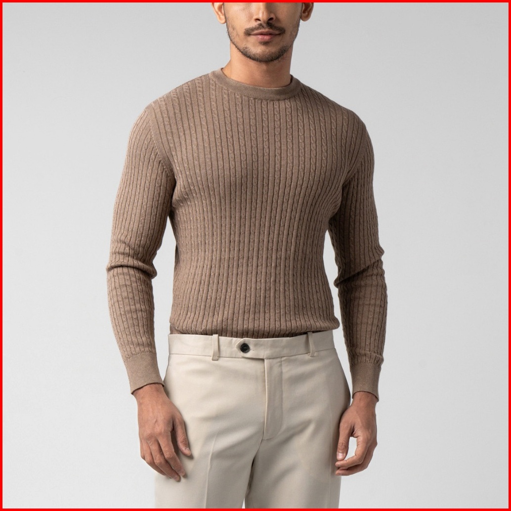 Vengoz Sweater Rajut Pria Premium - Mens Cable Knit Cotton Sweater Light Brown Ls