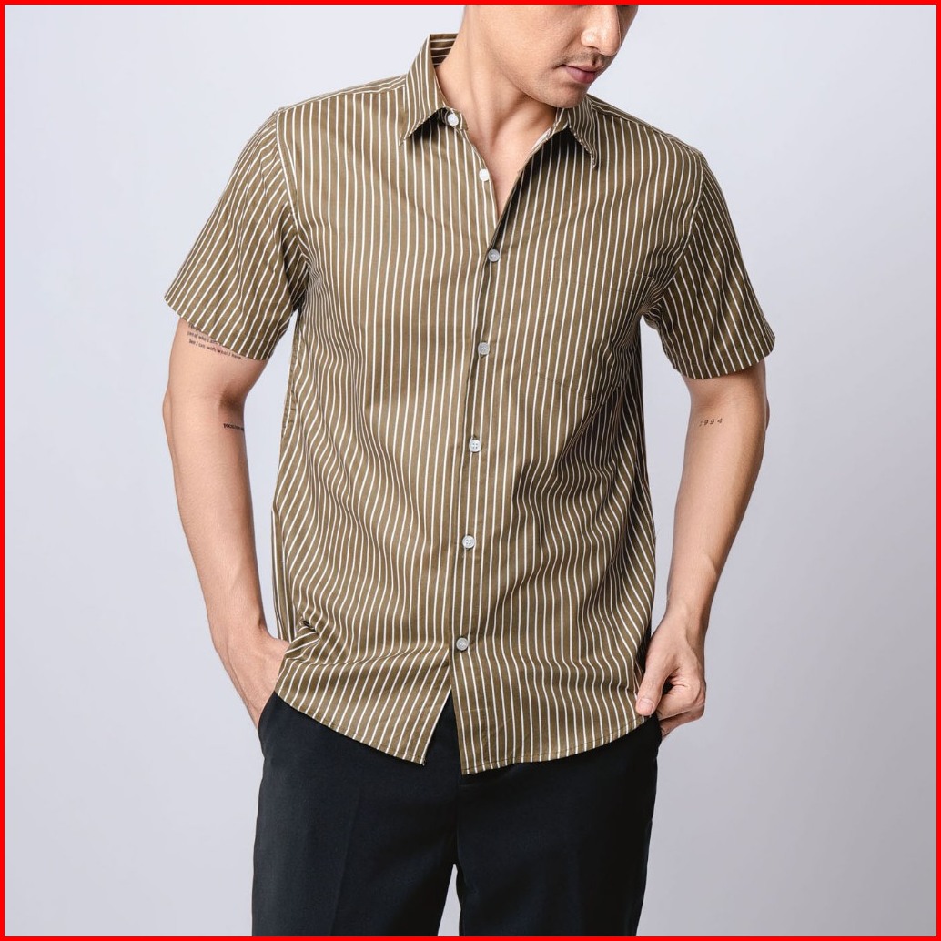Vengoz Kemeja Pria Slim Fit - Hugo Stripe Shirt Dark Sage Green Ss