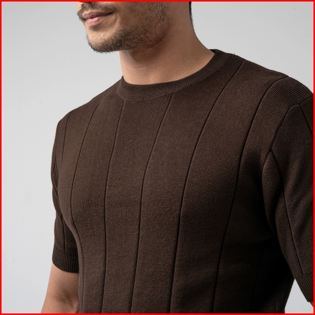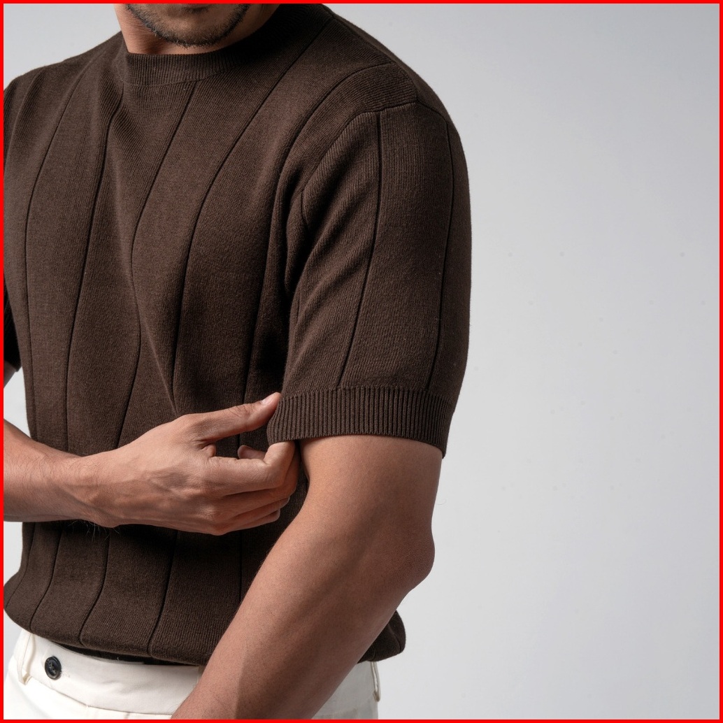 Vengoz Kaos Rajut Pria Premium - Mens Striped Knitted T-shirt Cotton Dark Brown Ss