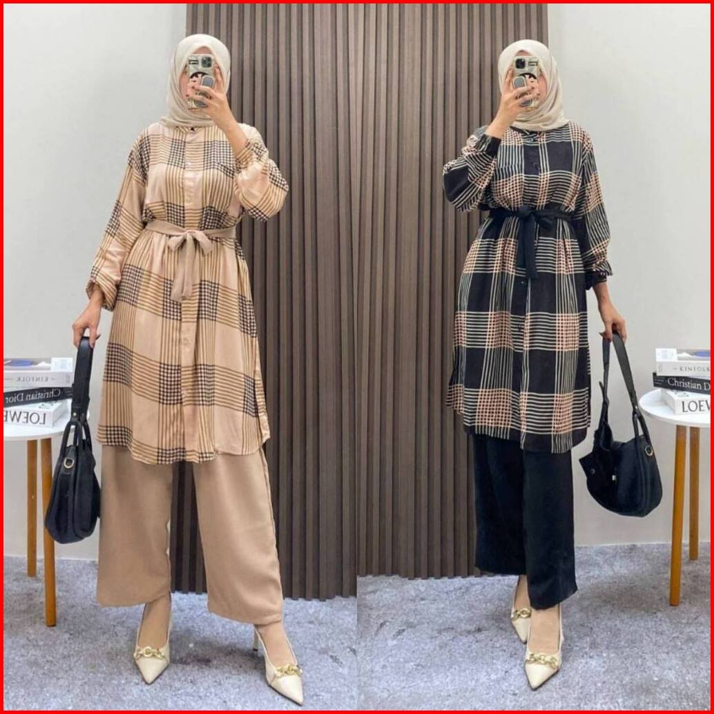 Malika One Set Setelan Tunik Motif Kotak Rayon Diamond