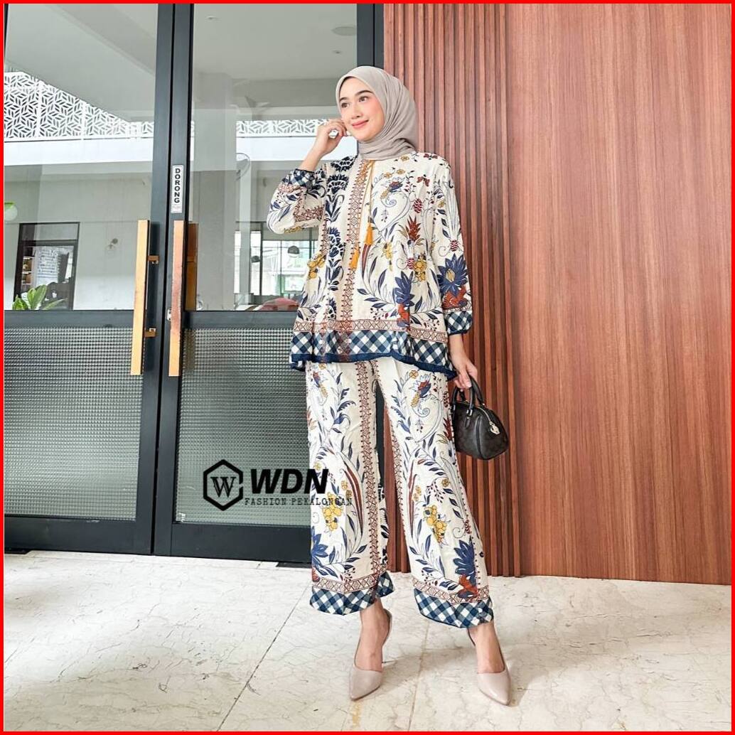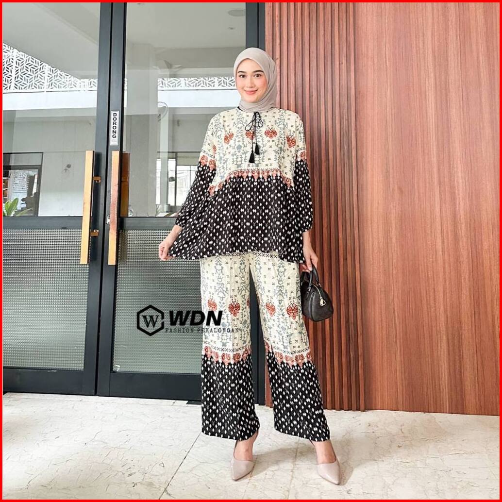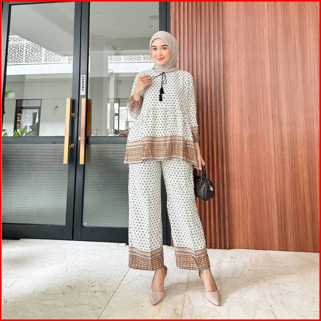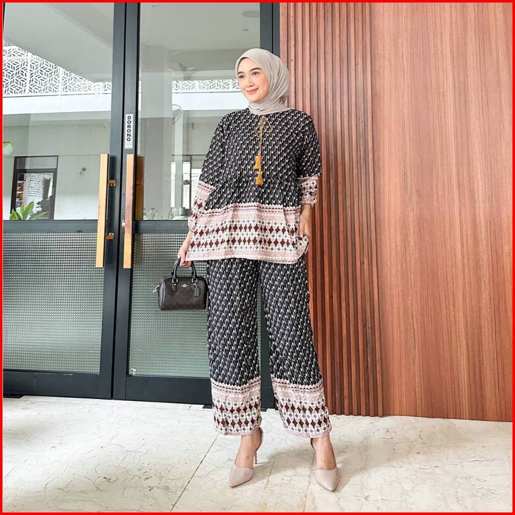 Helva Oneset Bahan Rayon Motif Setelan Wanita Celana Kulot Atasan Resleting Depan Variasi Tali Tasel Busui Fraindly